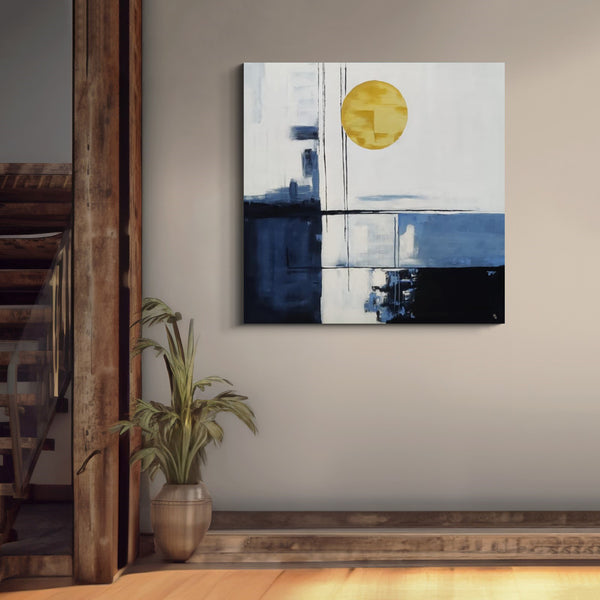 The painting features a striking composition divided into four quarters, rendered in black and white. The first quarter showcases a captivating sun, creating a mesmerizing contrast against the monochromatic backdrop....
