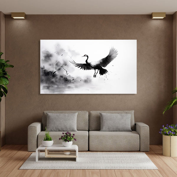 This painting depicts a serene Asian landscape with a majestic crane soaring through the air. The artwork is done in a monochrome style, using only shades of black and white....