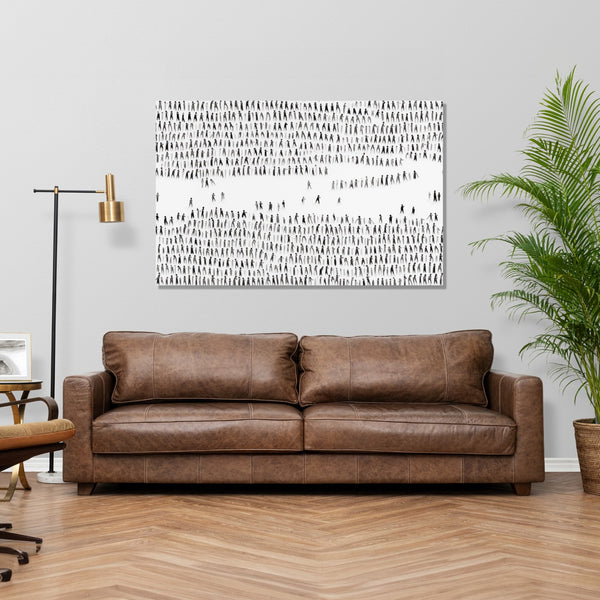 This painting depicts a lone traveller journeying through a mesmerizing landscape. The artwork is done in a monochrome style, with shades of black, white, and gray dominating the canvas. The...