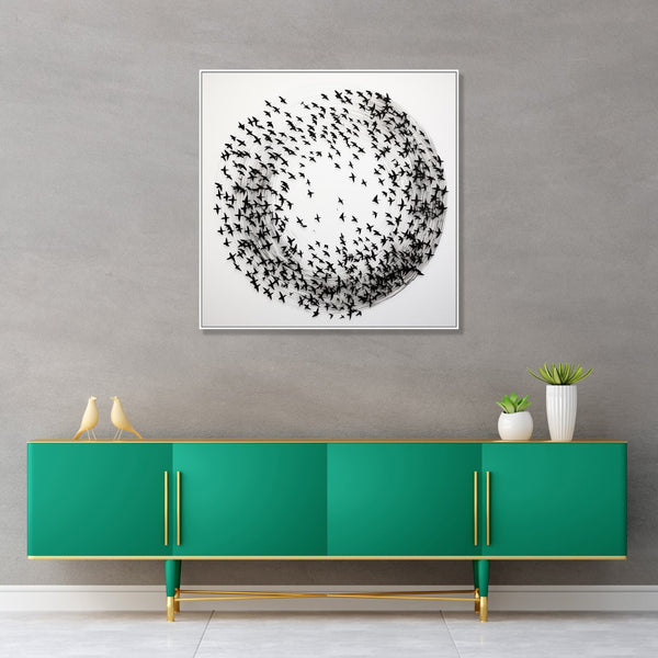 Circular monochrome depicting ariel movement of birds.