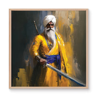 A majestic handmade painting of a Sikh saint holding a glowing sacred scripture, symbolizing divine knowledge and enlightenment. Ethnic luxury decor with spiritual vibes, perfect for prayer rooms or meditation...