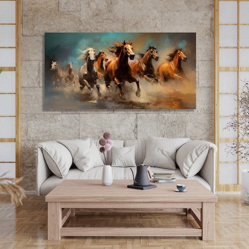 This painting depicts a lively scene of four brown horses and three white horses running freely. The horses are set against an background that adds a touch of mystery and intrigue to the artwork. The artist has also incorporated the element of water, which adds a sense of movement and fluidity to the overall composition. The combination of the running horses, background, and water creates a visually captivating piece of art.