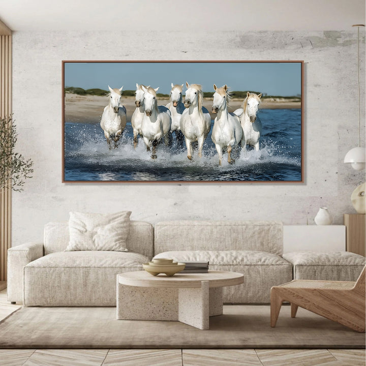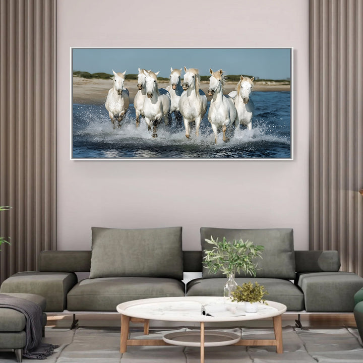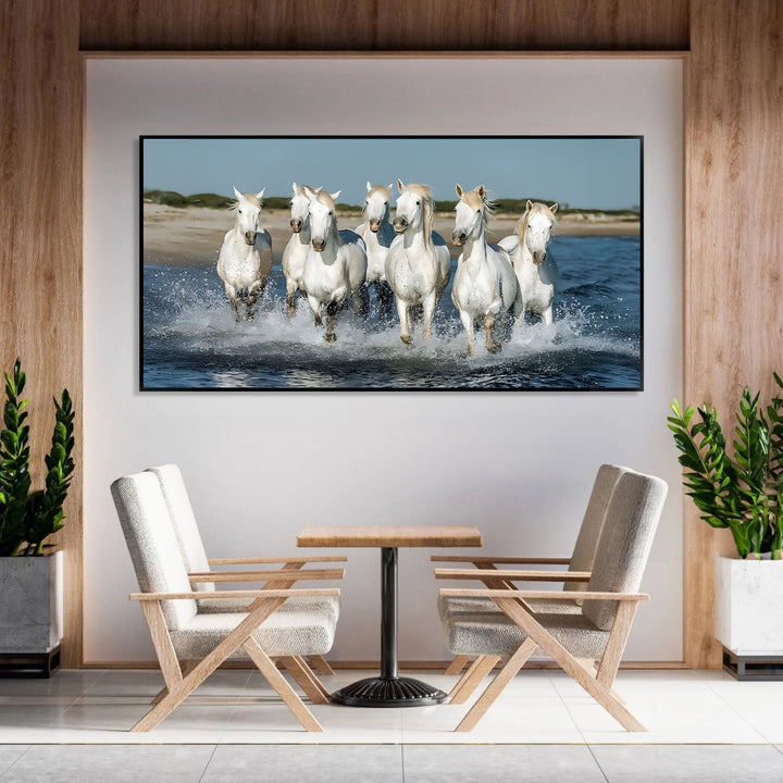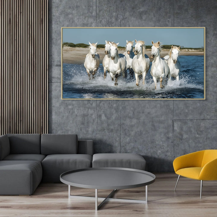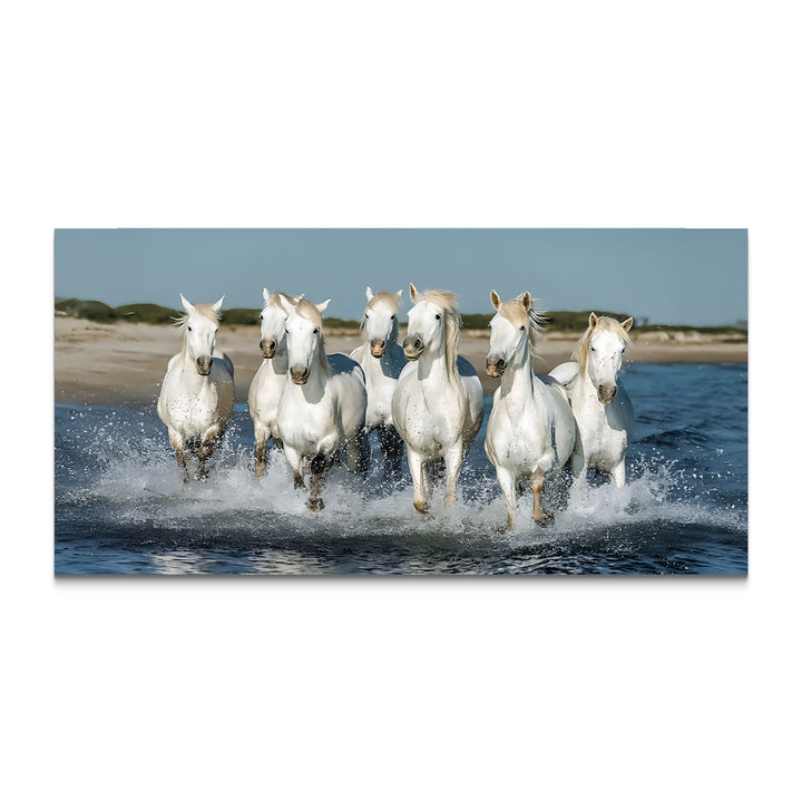 This painting depicts a breathtaking scene of pure white horses galloping gracefully on water. The horses appear incredibly lifelike, their sleek bodies and flowing manes captured in exquisite detail. The backdrop showcases a serene and clear sky, with a peaceful river bank in the distance. The overall effect is one of̨̍_ beauty, as the horses seem to effortlessly glide across the water's surface. It is a stunning portrayal of nature's elegance and the freedom of these majestic creatures.