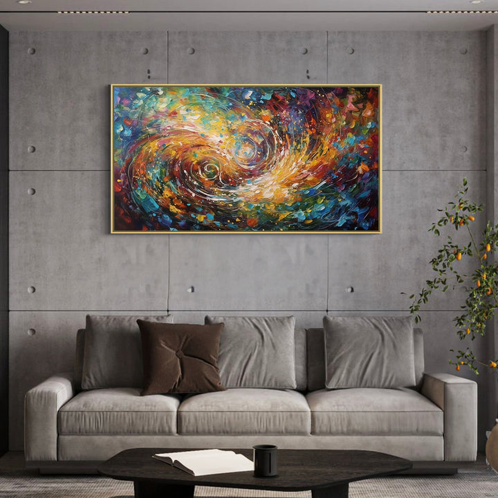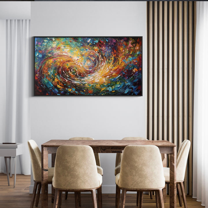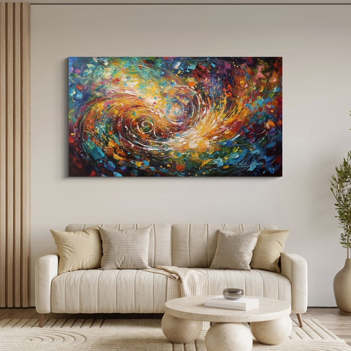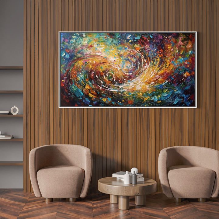 In 'Whirling Harmony' a subtle and colorful background sets the stage as two graceful swirl lines converge towards the center, creating an abstract and mesmerizing composition that exudes balance and unity, while inviting contemplation and reflection.