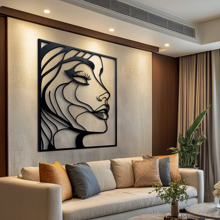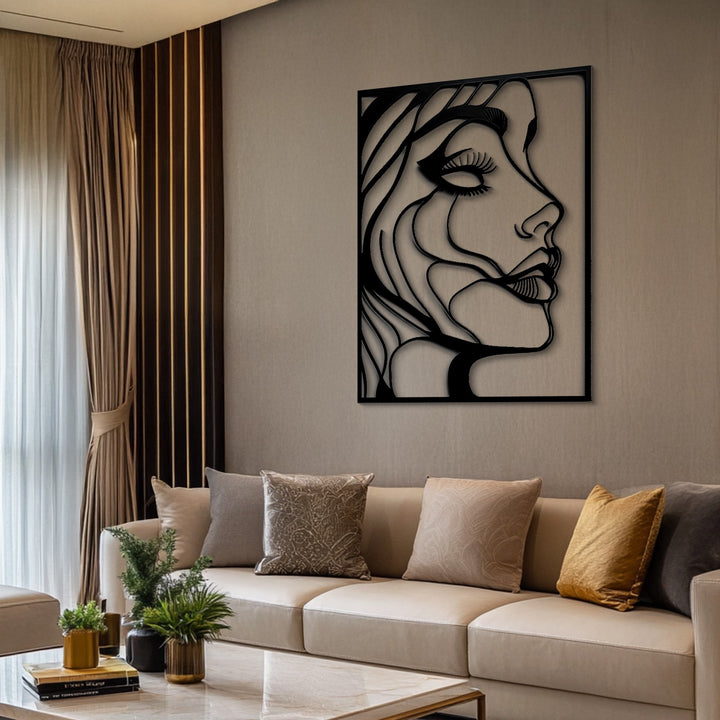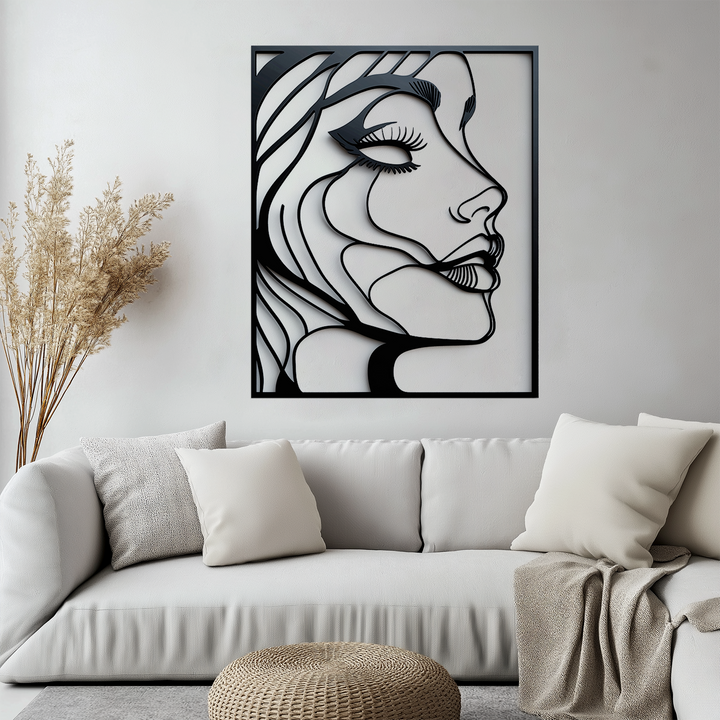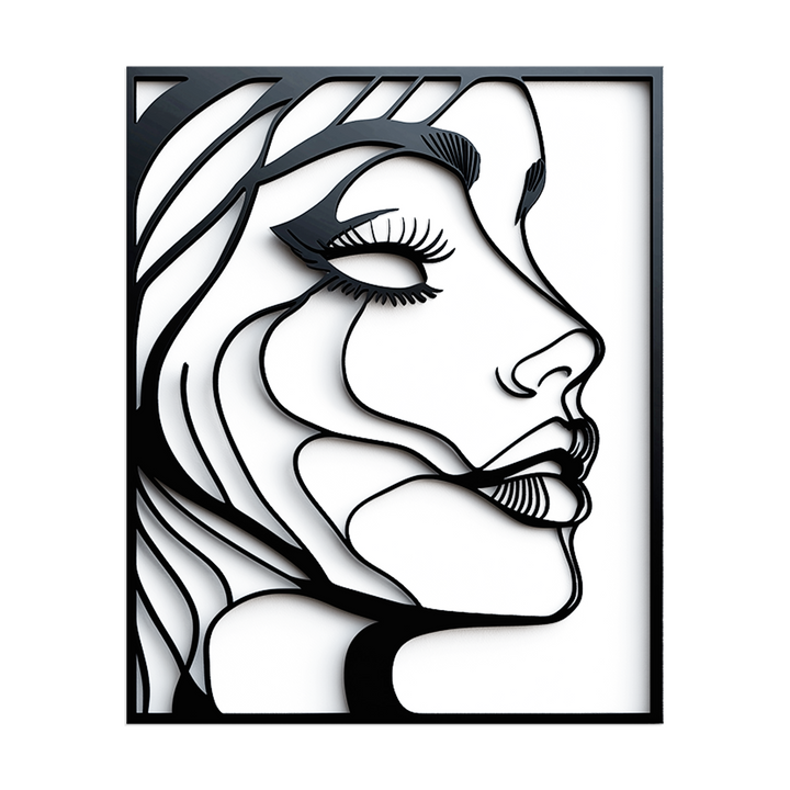 Black and white metal artwork featuring a geometric female portrait. A luxury home wall sculpture, perfect as aesthetic wall hanging art or elegant decor.