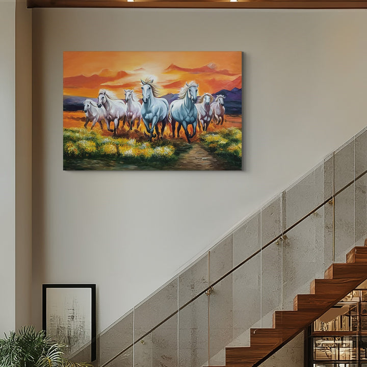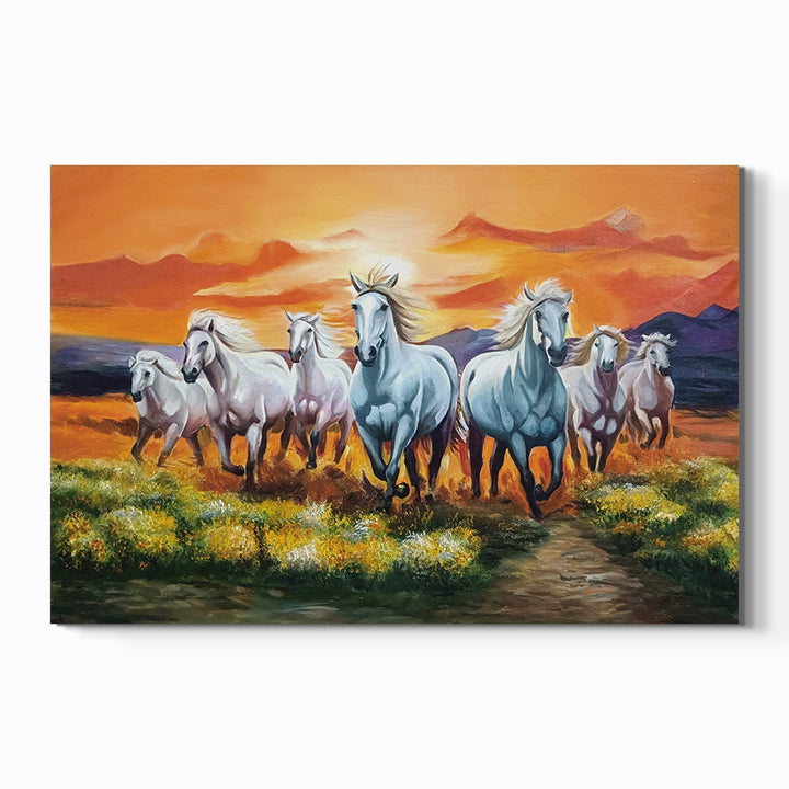 An Oil colour painting of 7 Horses (Vastu positive) with sunrise in background and orange hues.