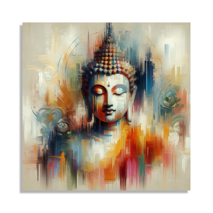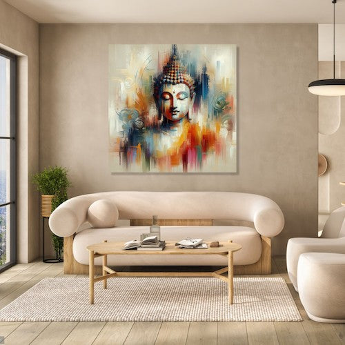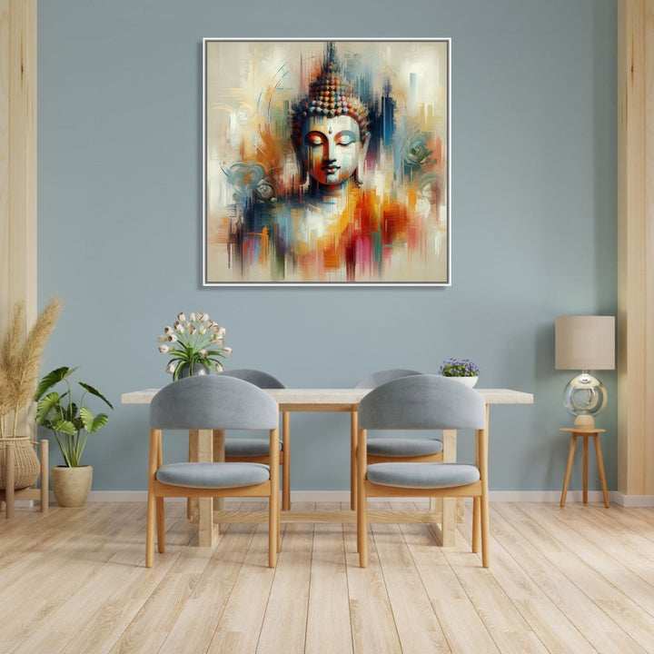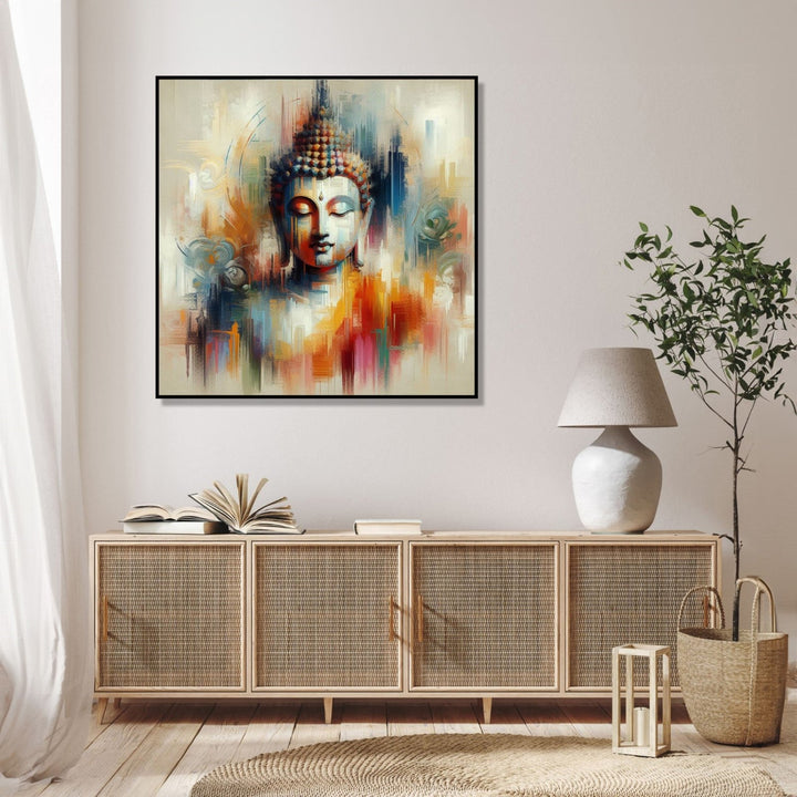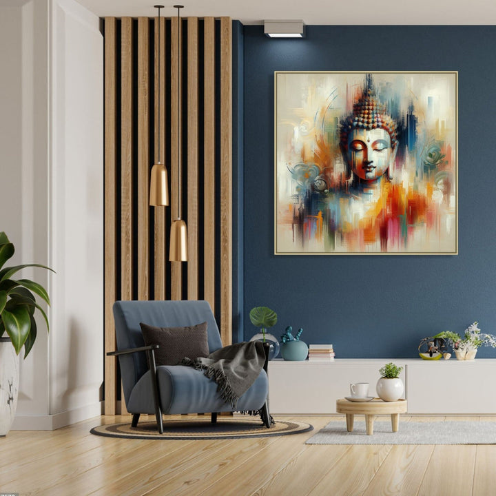 The painting features a serene Buddha in a meditative pose, set against a plain background with shapes and patterns. Buddha painting attracts calm, positive energies in the house.