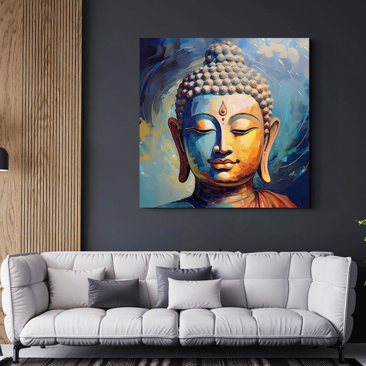 This captivating handmade art painting portrays a figure reminiscent of traditional depictions of Buddha. The subject features tightly curled hair, elongated earlobes, and is adorned in what appears to be an orange robeÌÎÌÓa color often associated with spiritual enlightenment. The central part of the face intentionally remains blurred, inviting contemplation. The background, a blend of brushstrokes in blue and yellow tones, adds dynamism and energy to the serene subject. Overall, this artwork beautifully balances tradition and modernity, inviting viewers to explore inner peace and self-awareness.