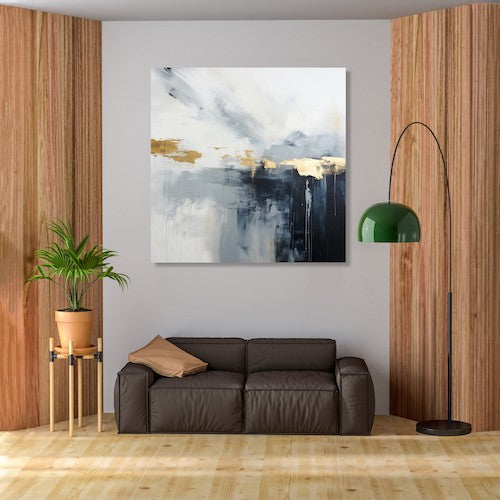 This painting is an abstract piece that primarily uses black, grey, white, and gold colors. The artist has created a composition that is non-representational, allowing the viewer to interpret the artwork in their own way. The use of these colors creates a sense of contrast and balance within the painting. The gold accents add a touch of elegance and sophistication to the overall composition. It is a visually captivating piece that invites contemplation and exploration of its various shapes and forms.