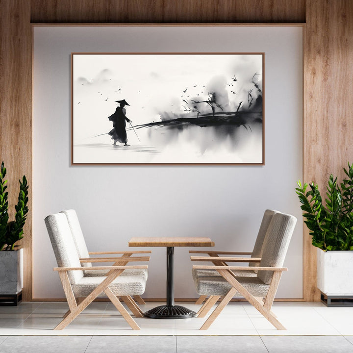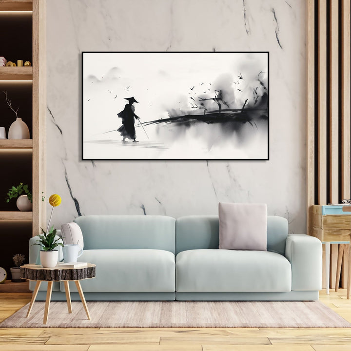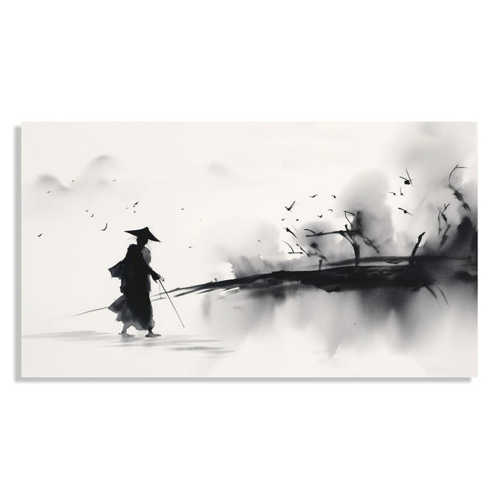 This painting depicts a lone traveller journeying through a mesmerizing landscape. The artwork is done in a monochrome style, with shades of black, white, and gray dominating the canvas. The traveller is portrayed in traditional Asian attire, adding a cultural touch to the scene. The landscape is filled with swirling shapes and lines, creating a sense of movement and mystery. The overall composition evokes a sense of tranquility and contemplation, inviting viewers to imagine the traveller's story and the vastness of the world they are exploring.