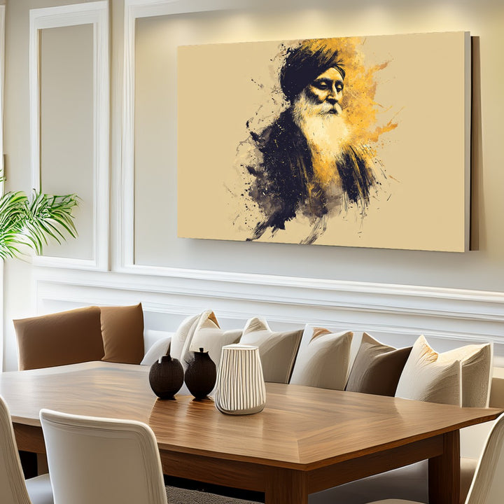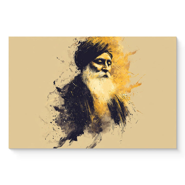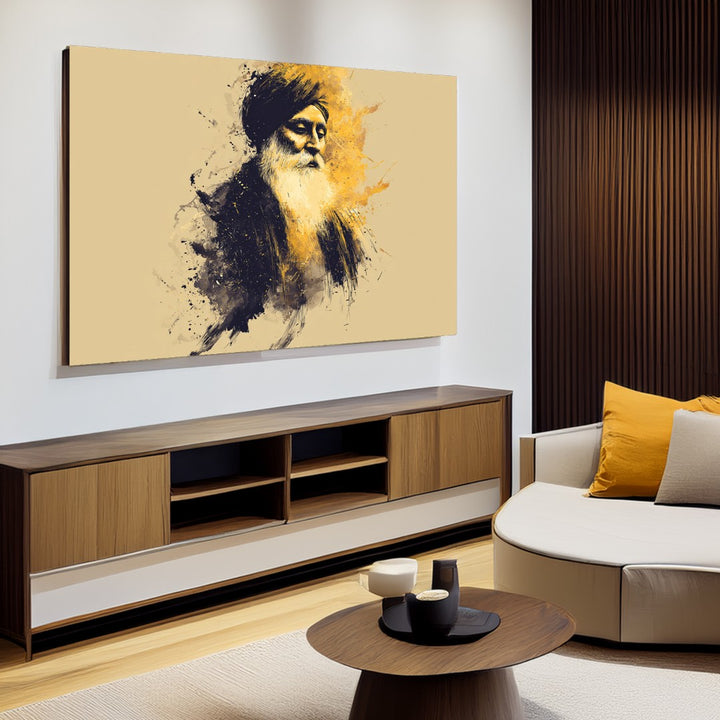 A contemporary portrait of a Sikh Guru with golden artistic splashes. Perfect for modern homes that want a touch of spirituality blended with art aesthetics.