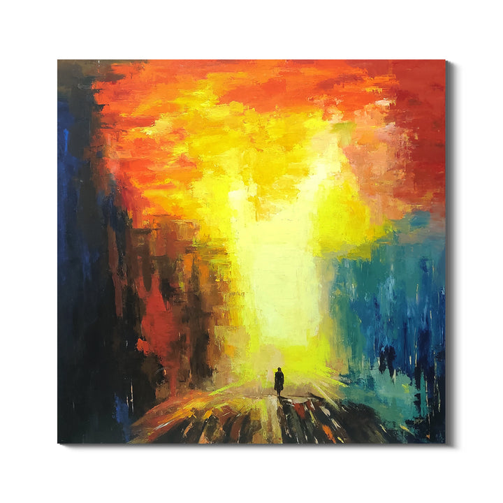 This is an abstract artwork encapsulates the essence of embarking on a transformative path, with intense yellow centre, symbolizing hope, determination, and the journey into the unknown. The painting represents the difficult journey of life where hopeful future is the guiding path.