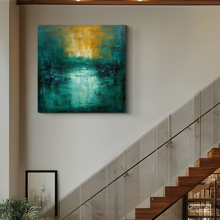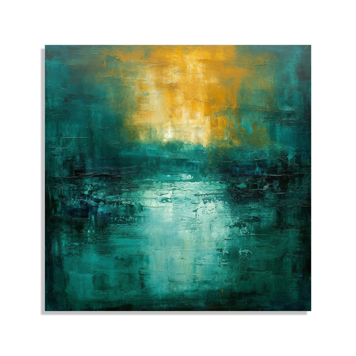 This is an abstract painting that immerses the viewer in a world of bluish-green hues. At the centre, a soft, radiant yellow light beams up, casting a luminous glow, creating a mesmerizing reflection in light green. The artwork captures a moment of serene, otherworldly beauty, evoking a sense of tranquility and wonder.