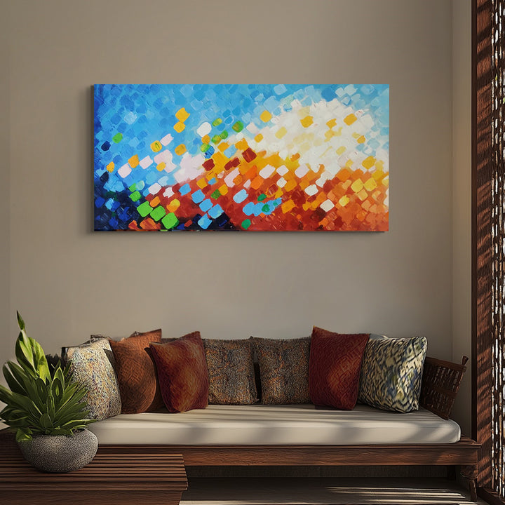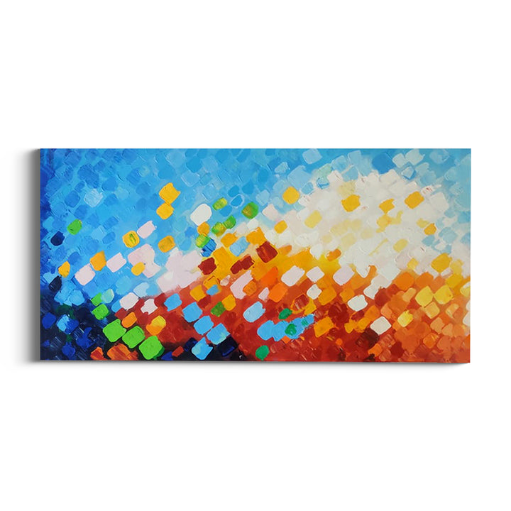 This painting features an abstract composition with a vibrant array of colors. The image is filled with small, square brushstrokes in shades of blue, orange, yellow, green, and white, creating a dynamic and visually engaging pattern that transitions smoothly from cool to warm tones.
