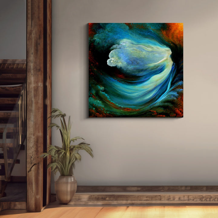 The painting showcases a fluid, ethereal form resembling a figure in motion, enveloped by swirling hues of deep blues, greens, and fiery reds. The abstract style evokes a sense of graceful energy, merging both serenity and intensity in its sweeping brushstrokes