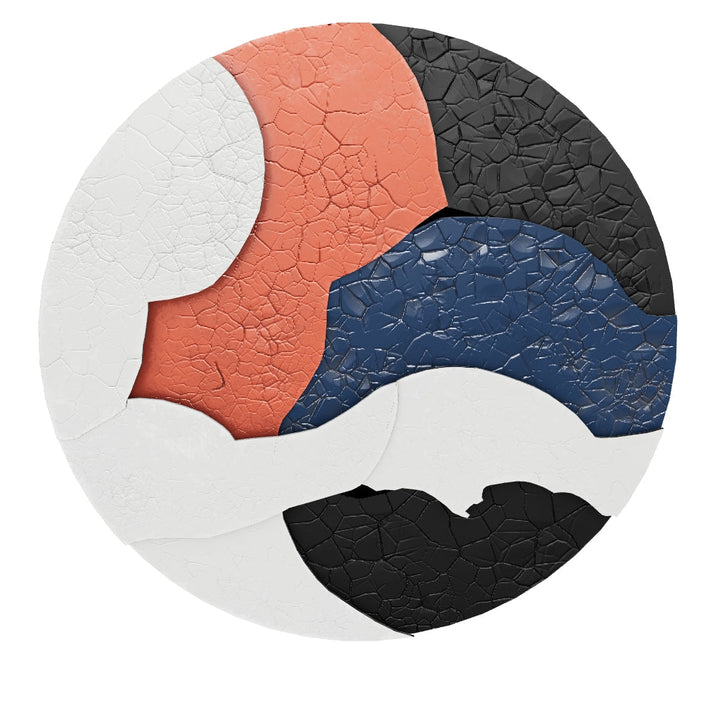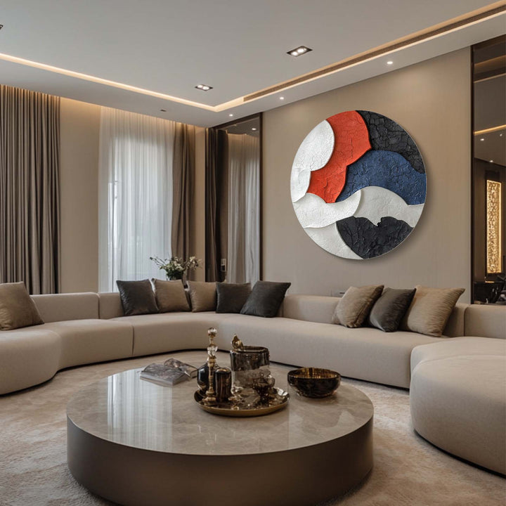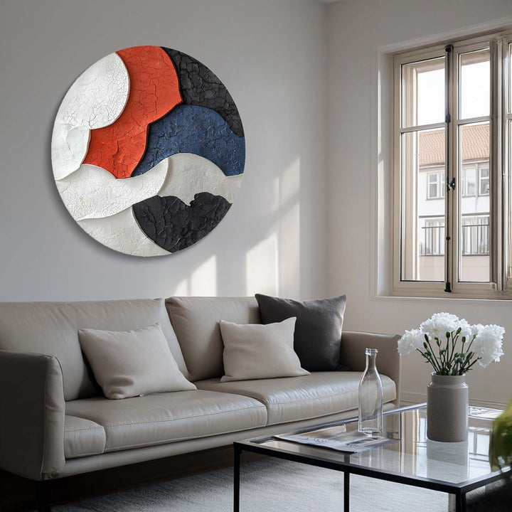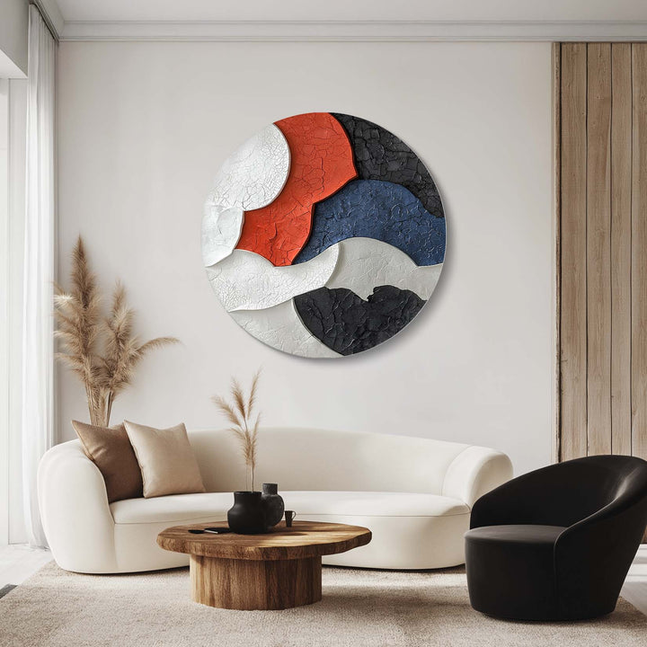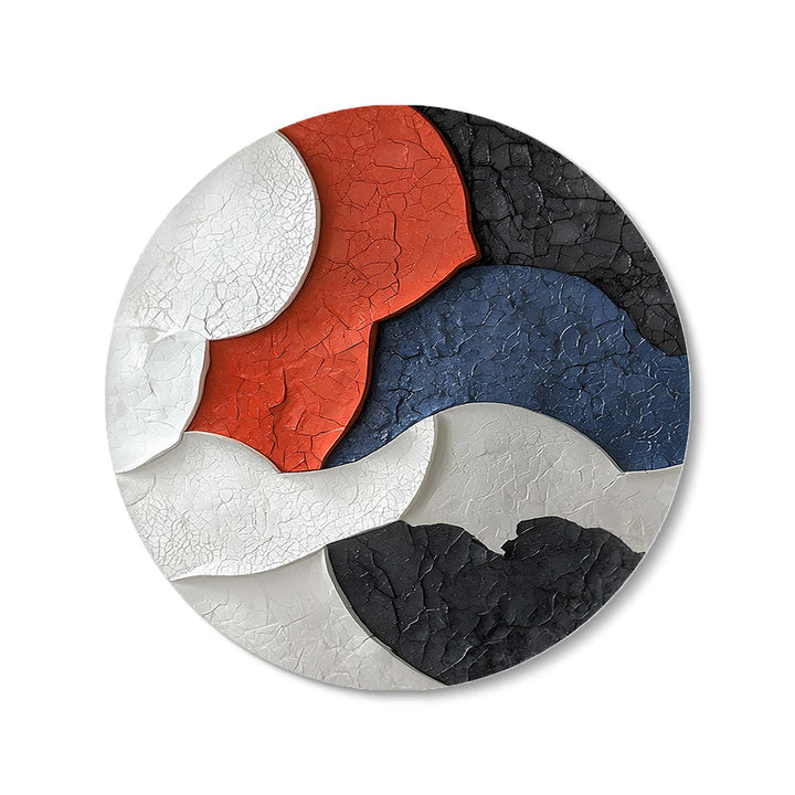 This stunning abstract Texture artwork features an intricate cracked texture with a bold color palette of red, blue, black, and white. The circular shape enhances its visual appeal, making it an excellent choice for modern interiors.