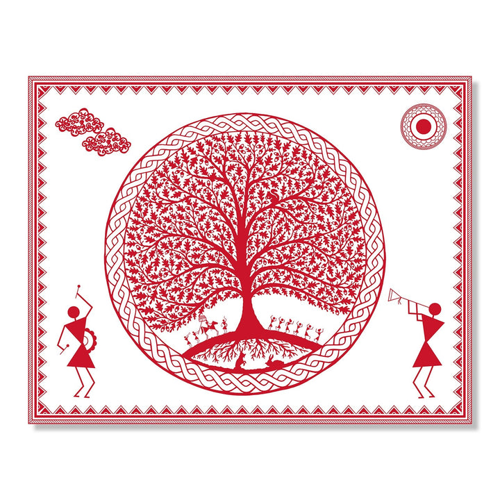 This handmade painting features a stunning large tree as the focal point, with intricate branches and leaves that are beautifully detailed. The tree is painted in a vibrant red color, standing out against a white background. The tree is enclosed within a circular border adorned with intricate patterns, adding to the overall aesthetic of the piece. To the left of the tree, a figure is depicted dancing with graceful movements, adding a sense of movement and energy to the painting. To the right of the tree, another figure is shown playing a trumpet or horn, adding a musical element to the scene. The painting is a fusion of Mandana and Aipan art forms, combining traditional Indian folk art styles to create a unique and visually striking piece. The intricate details and vibrant colors make this painting a true work of art that is sure to captivate and inspire all who view it.