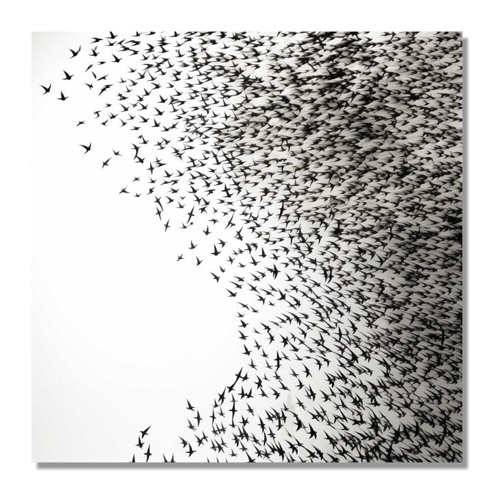 'Ariel Symphony 3' depicts birds flying in unison from right to left, creating a harmonious and orchestrated movement in the sky that evokes a sense of unity.
