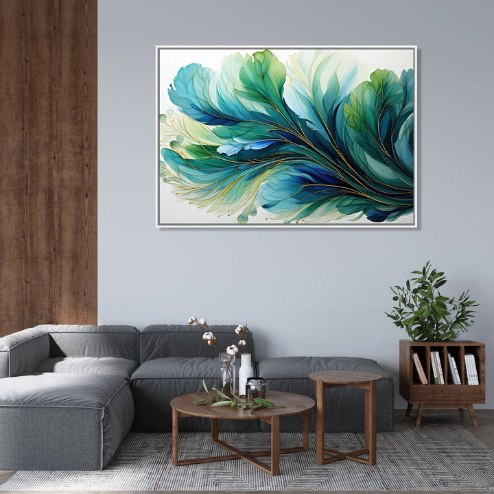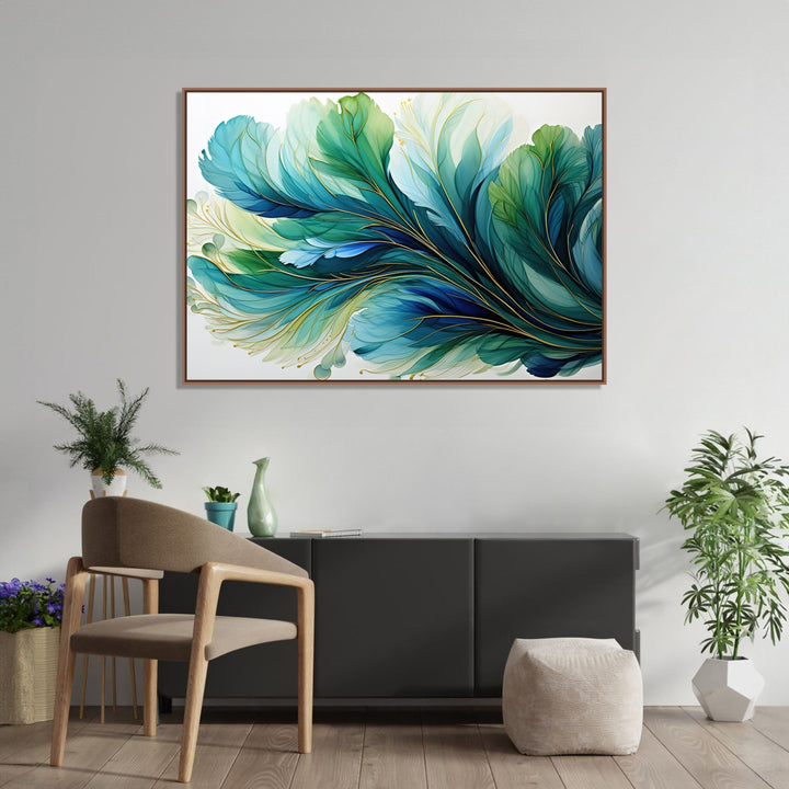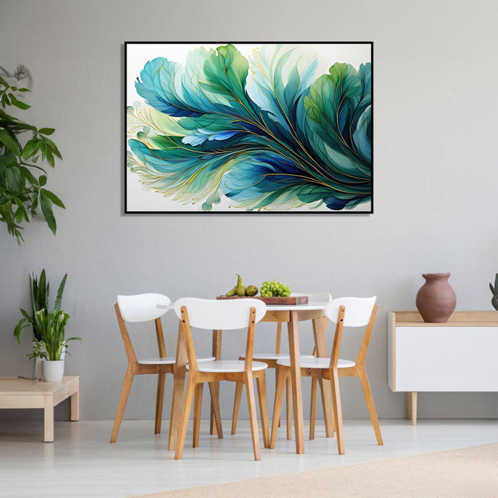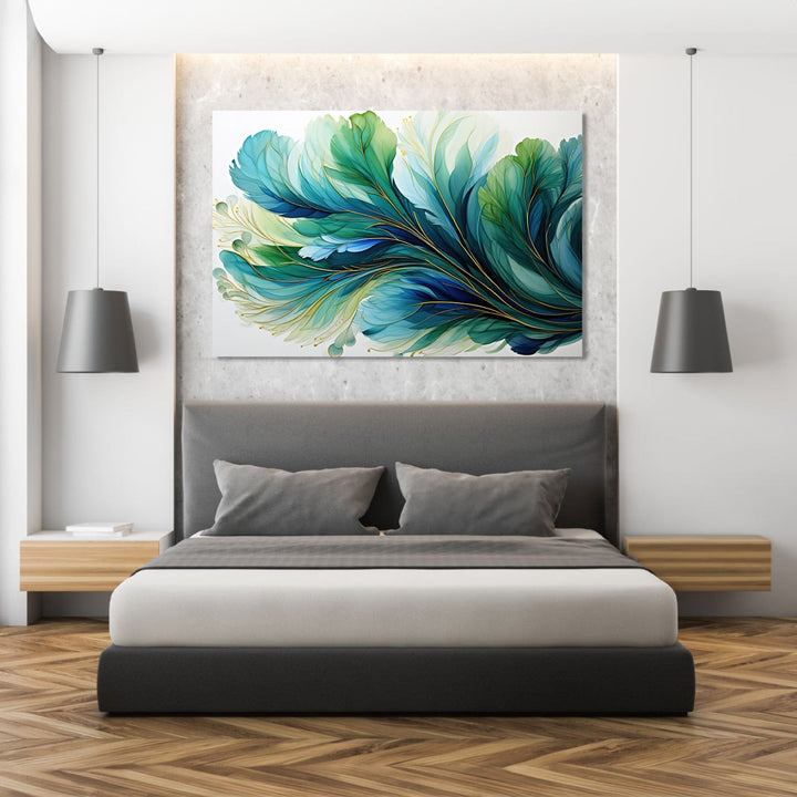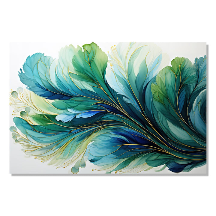 This stunning handmade painting features a mesmerizing golden effect that shimmers and glows against a water base of deep blue and vibrant green. The colors blend seamlessly together, creating a sense of movement and depth within the artwork. A delicate feather is delicately painted in the center, adding a touch of elegance and grace to the composition. The white background serves as the perfect canvas for the colors to pop and come to life. This unique piece of art is sure to captivate and inspire all who gaze upon it.