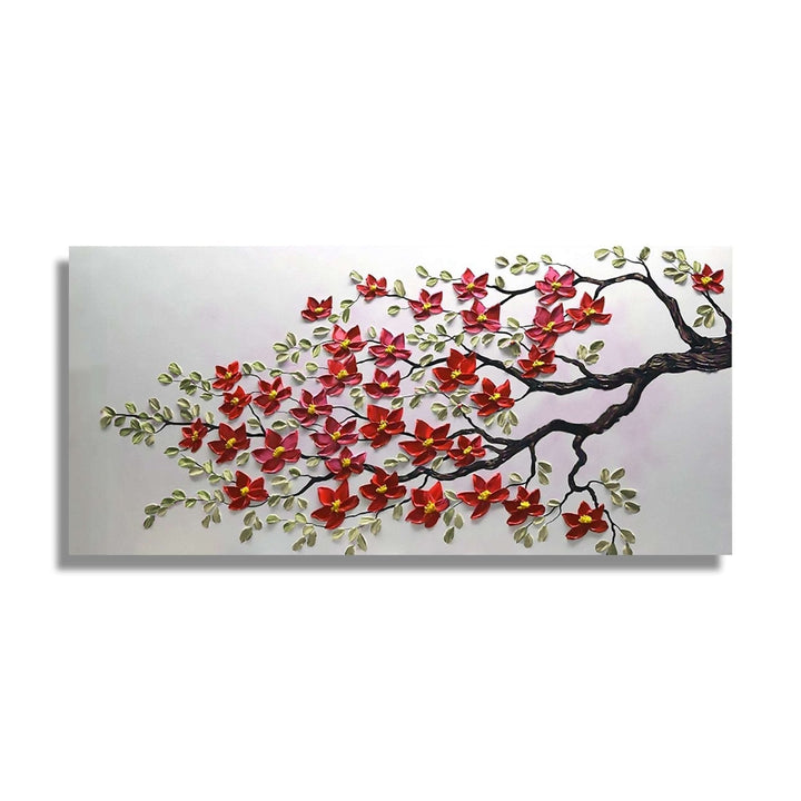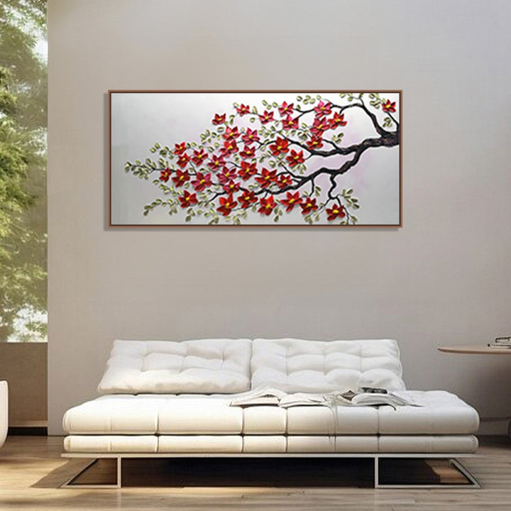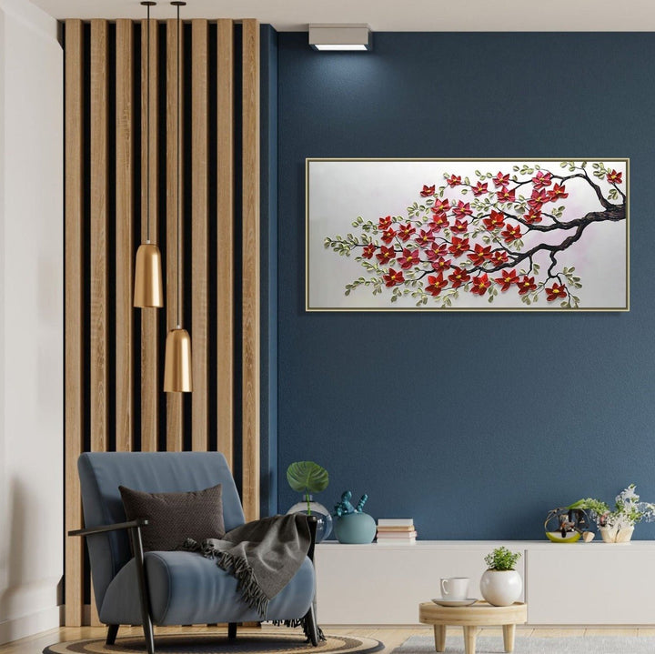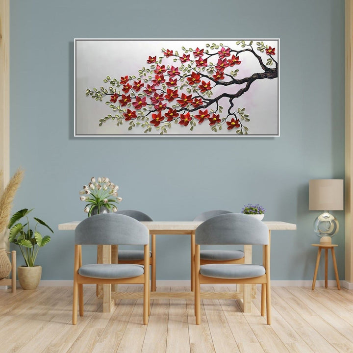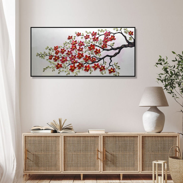 'Red Blooms' depicts spring tree branch adorned with vibrant red flowers and contrast green leaves, creating a serene and captivating scene that celebrates the beauty of nature. The stark contrast between beauty and youth of seasonal flowers and permanent matured branch holding them, reflects the depths of life and nature of changes we go through.