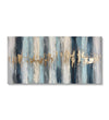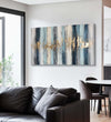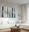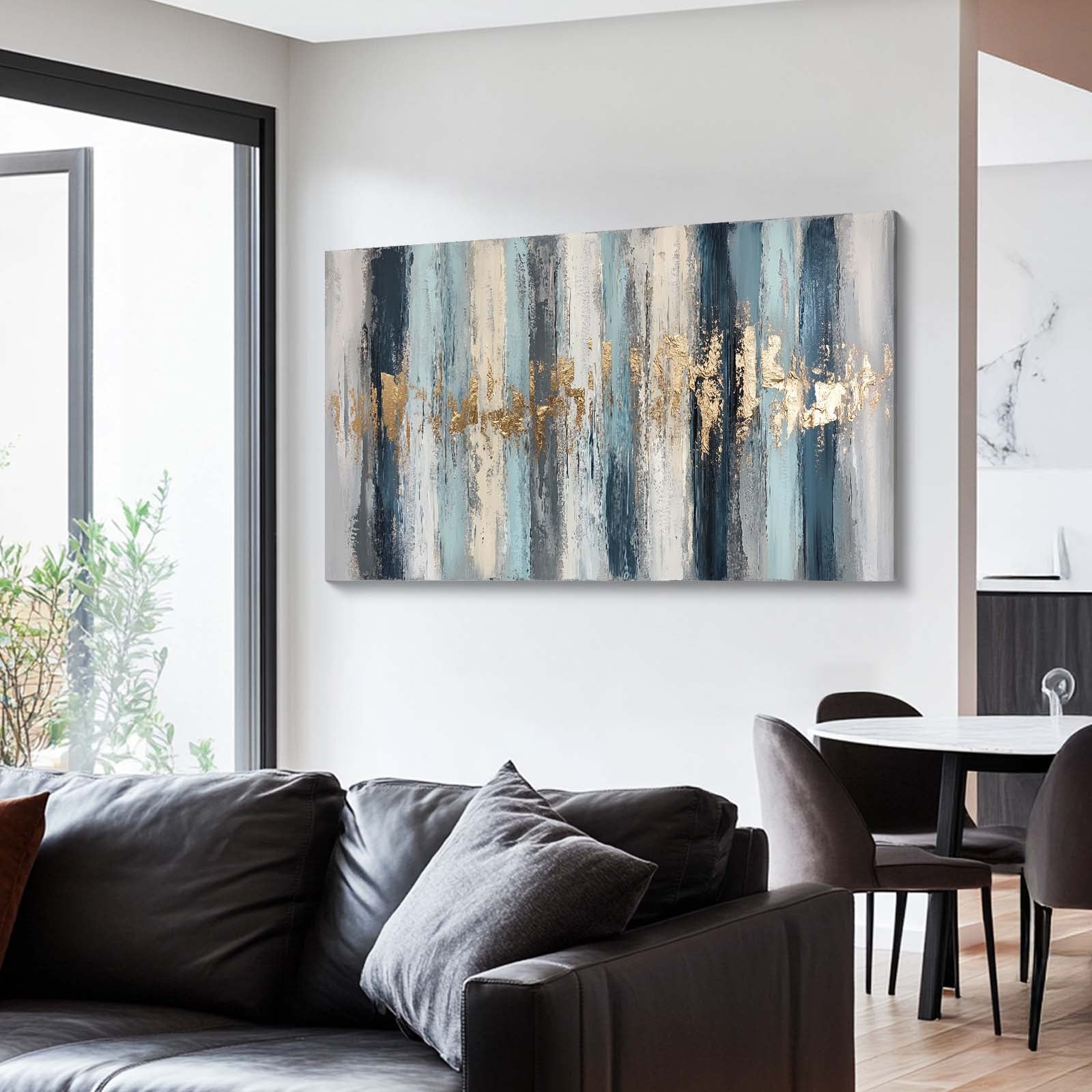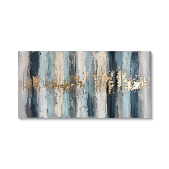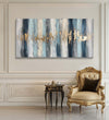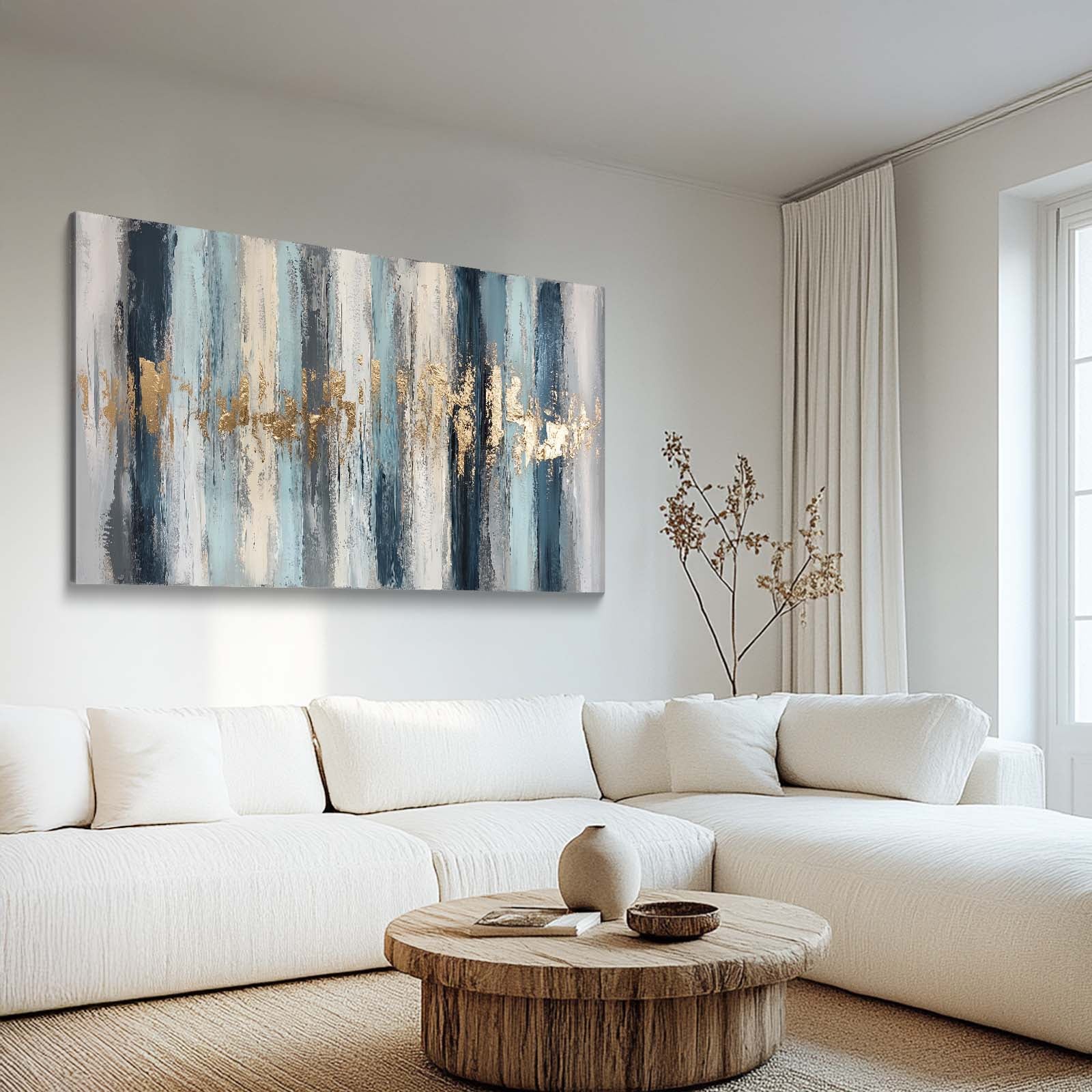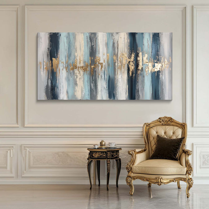 Vertical abstract lines in soothing blues and lavish gold textures for an elevated, contemporary style.