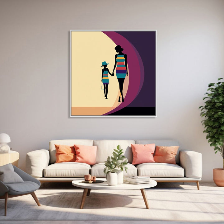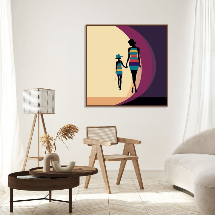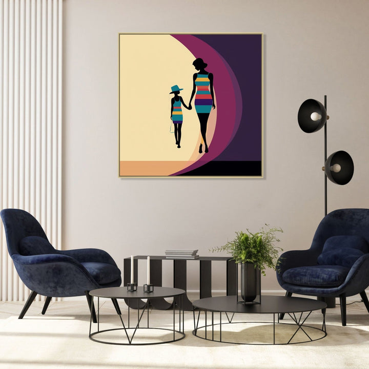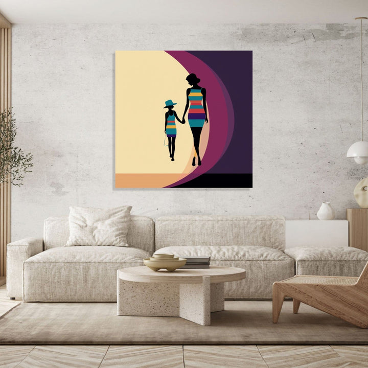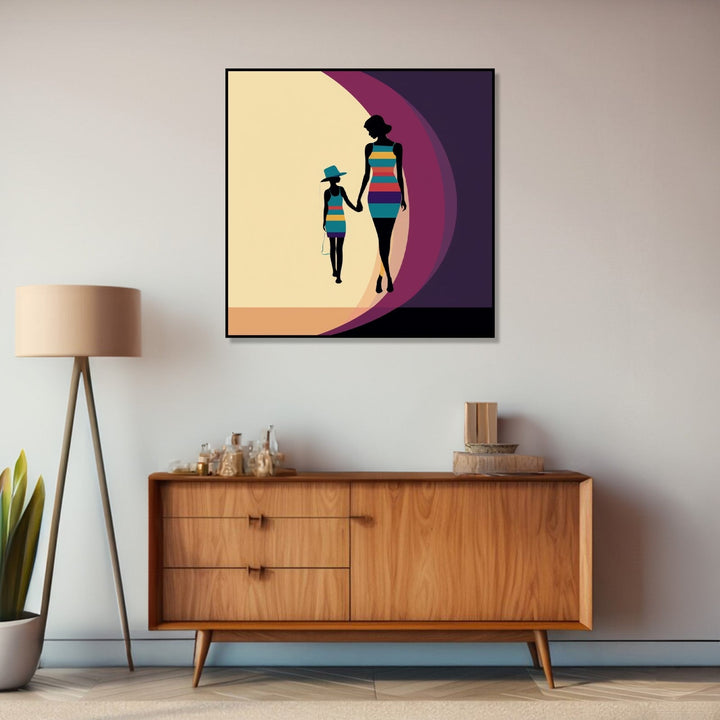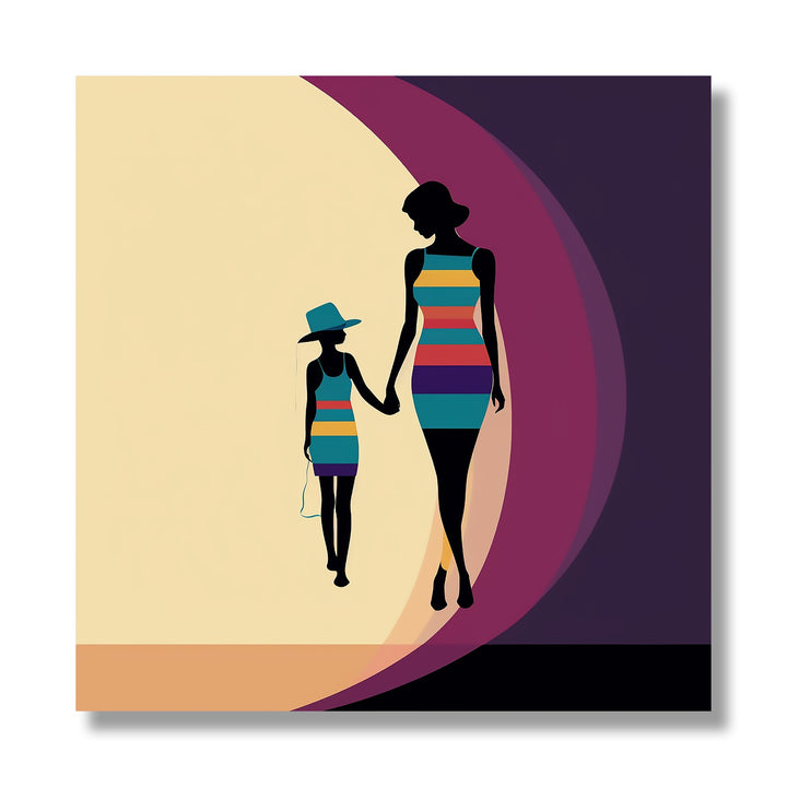 'Bond of Love' depicts a mother and child walking hand in hand, their shadows cast against a vibrant backdrop of colours. The mother is dressed in a flowing, colourful dress, symbolising the joy and warmth of their relationship.