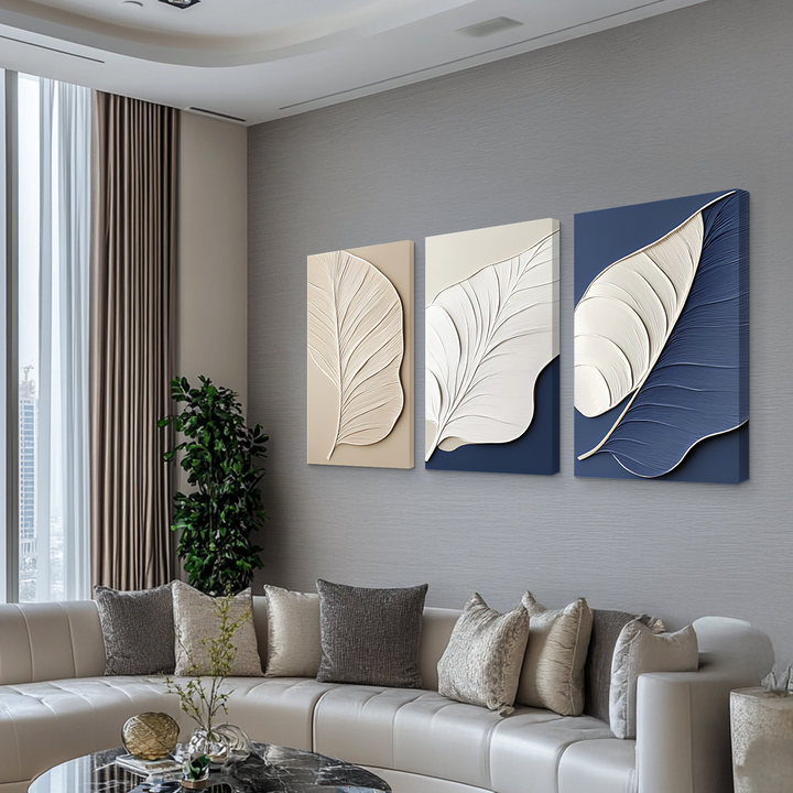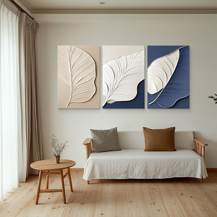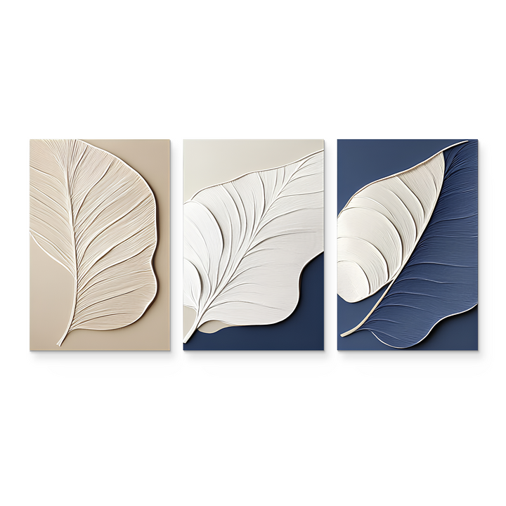 Design: A chic three-panel design with an arrangement of botanical leaves that overlap multiple times.