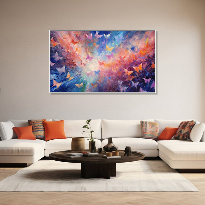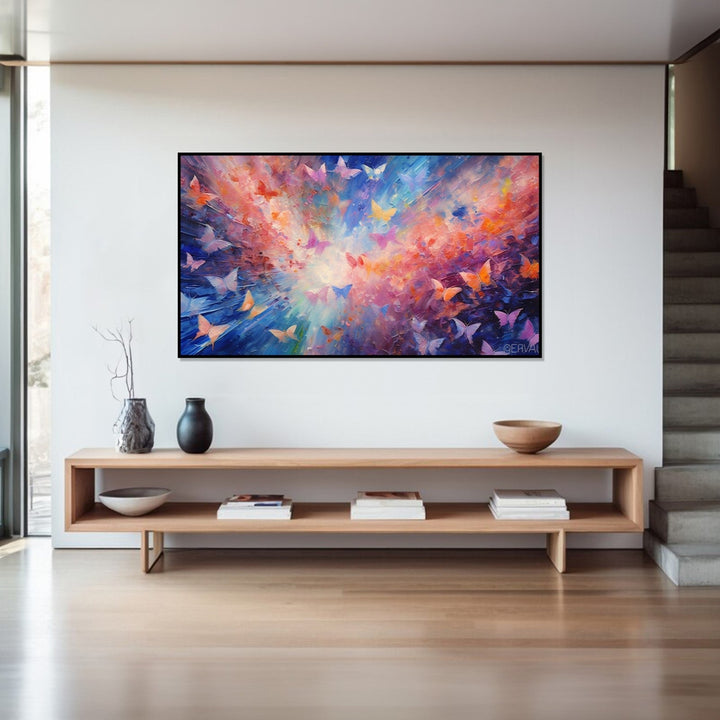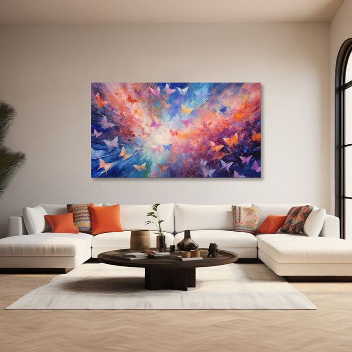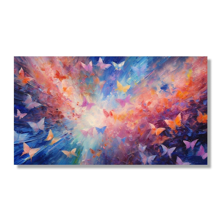 'Butterfly Dreams' unveils a captivating abstract painting with a blue and peach-coloured background and a vibrant array of butterflies takes flight in the foreground, weaving a whimsical and ethereal narrative of transformation, beauty, and imagination.