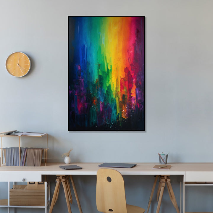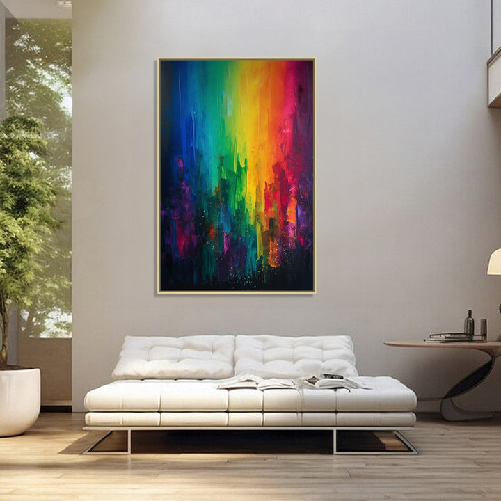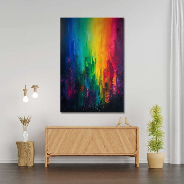 In 'Cascade of Colours' a vibrant and chaotic array of hues runs down from the top of the canvas in a dazzling display, evoking a sense of dynamic motion and exuberant energy.
