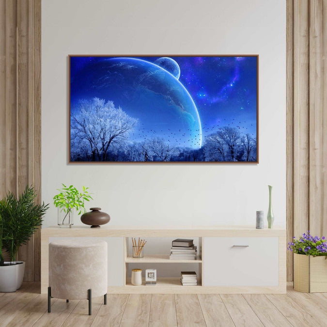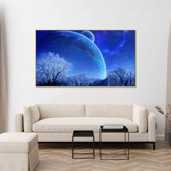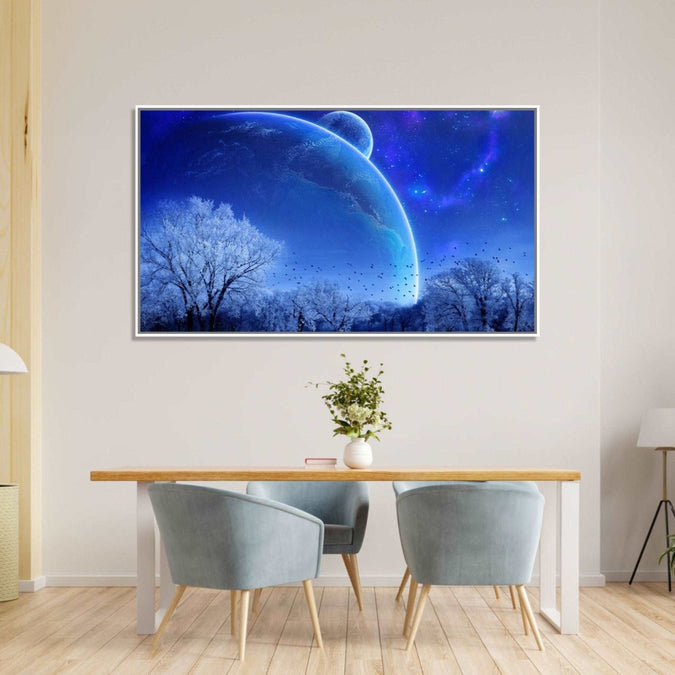 "Celestial Landscape" depicts two celestial bodies visible from a blue planet with white trees. The color theme revolves around soothing shades of blue, creating a cosmic and dreamlike atmosphere.
