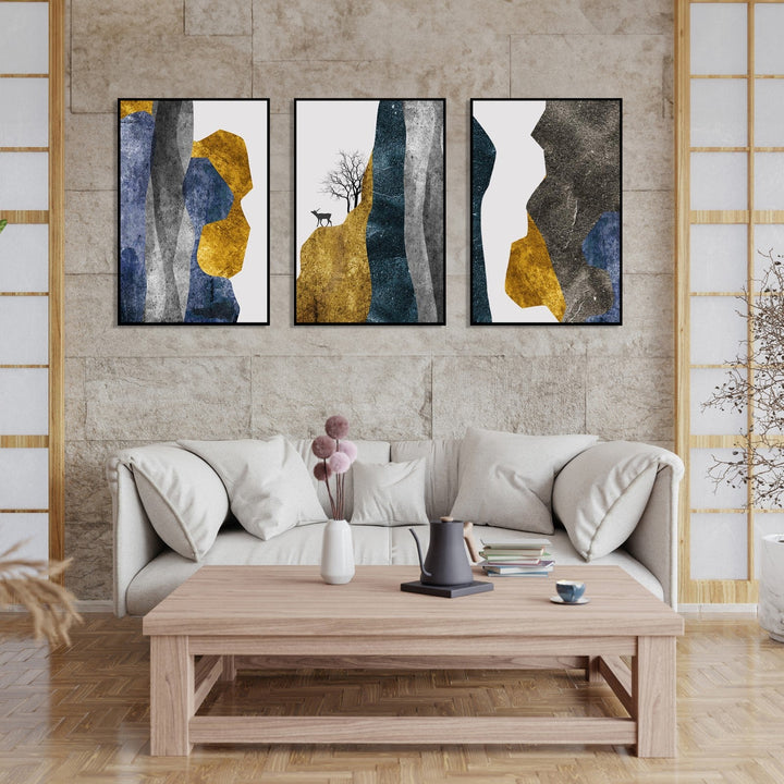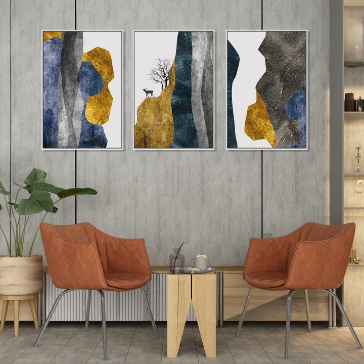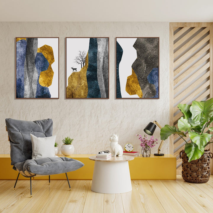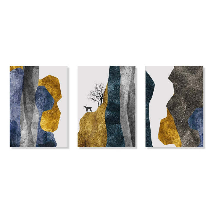 This handmade painting is a stunning piece of art that features abstract shapes in a beautiful color palette of blue, gold, and grey. The textured appearance of the painting adds depth and dimension to the overall composition. In the center of the painting, there is a solitary tree and a deer, which brings a touch of nature to the otherwise abstract design. The tree stands tall and strong, while the deer adds a sense of tranquility and grace to the scene. The combination of abstract shapes and natural elements creates a harmonious balance in the painting, making it a truly captivating and unique piece of art.