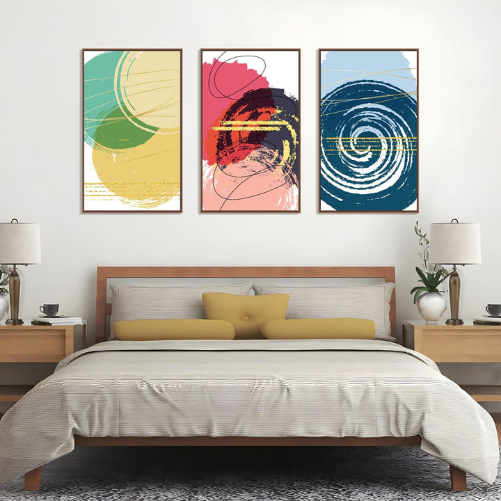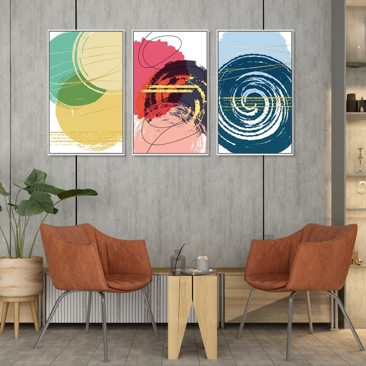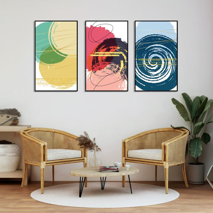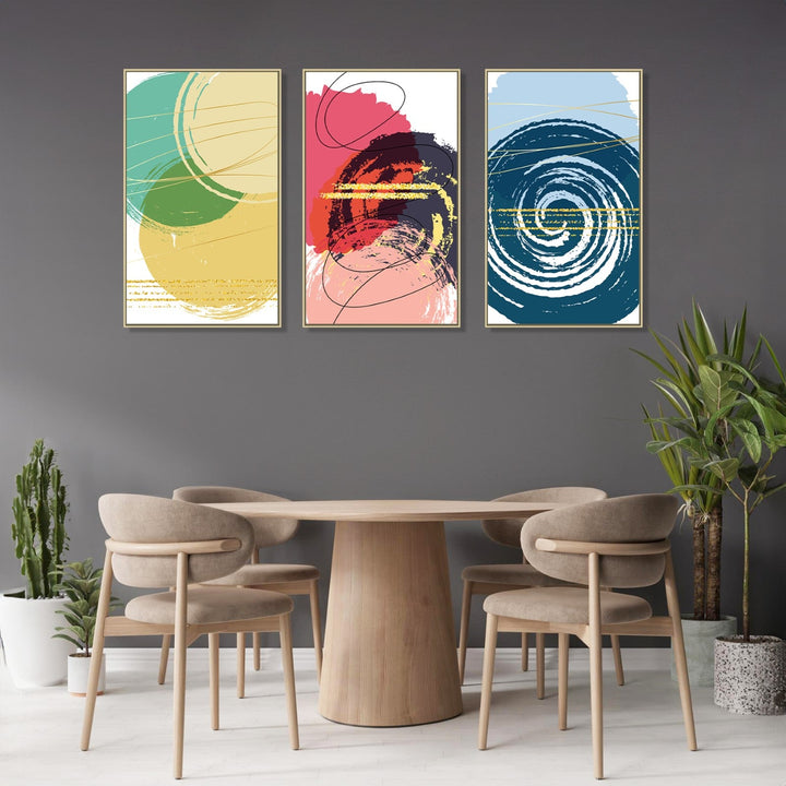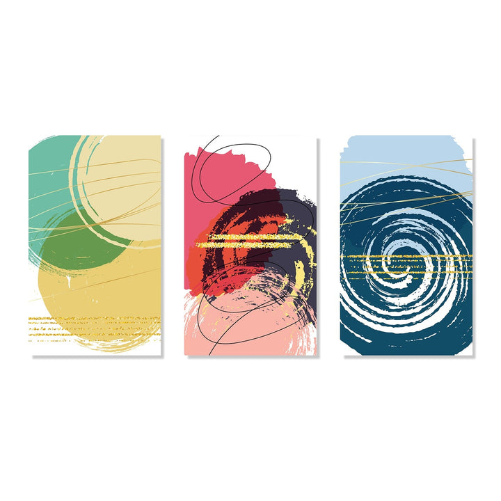 The first painting features a serene pale green background, adorned with overlapping circular shapes in darker green and yellow hues. Thin, wavy lines dance across the canvas, adding a sense of movement and fluidity to the composition. The second painting, set against a crisp white backdrop, showcases bold brush strokes in striking red, black, and yellow tones. These brush strokes partially obscure circular forms, creating a sense of depth and mystery. The third painting, with a light blue background, captivates the viewer with concentric circles that create a mesmerizing ripple effect. Horizontal golden lines intersect the circles, adding a touch of elegance and sophistication to the overall design. Each painting exudes a sense of energy and dynamism, inviting the viewer to get lost in the intricate details and unique shapes that make up these captivating works of art.