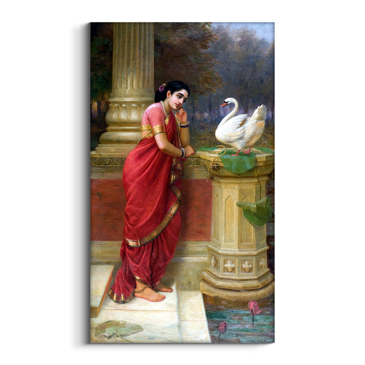 Damayanti in a red sari stands beside a column, leaning on a ledge and gazing at a white swan perched on a pedestal. The scene is set in a serene, classical environment with a water feature and lotus flowers in the foreground.
