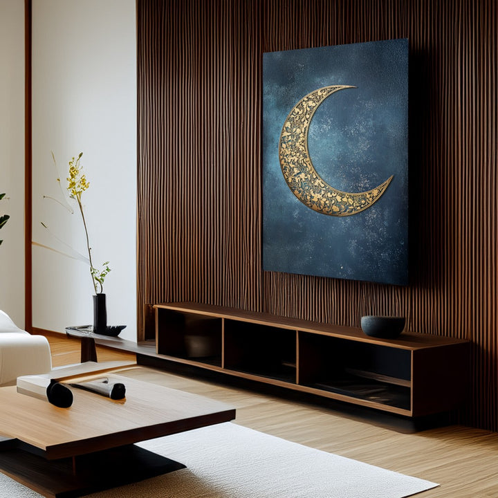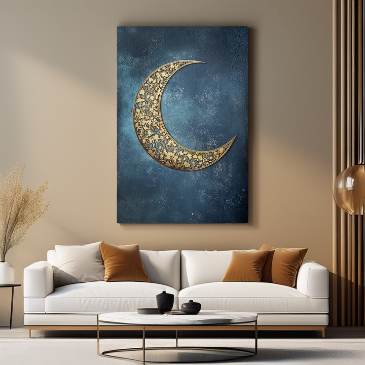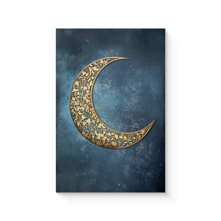 A beautiful Islamic crescent moon motif with intricate gold patterning on a textured blue canvas. Ideal for Eid decor, spiritual interiors, or as a sacred Islamic gift. The deep blue and gold tones exude richness and calm.