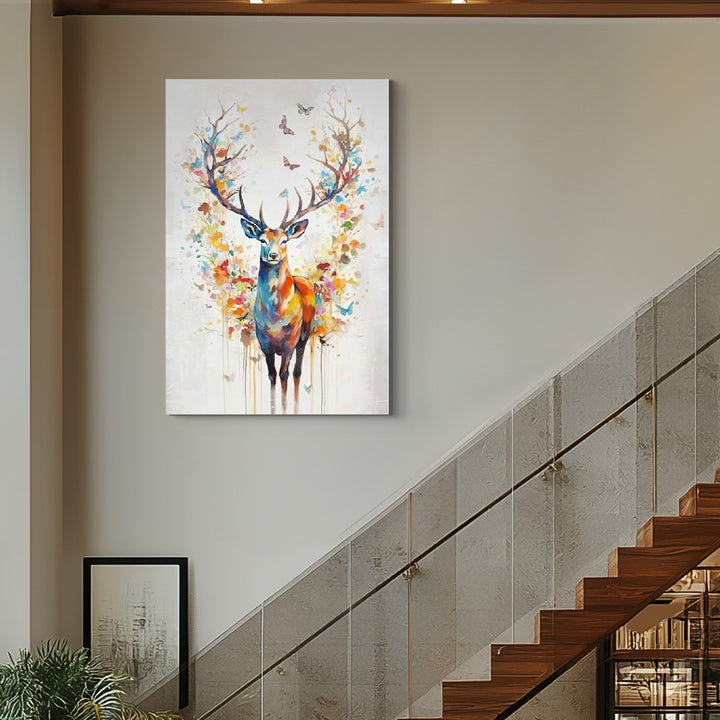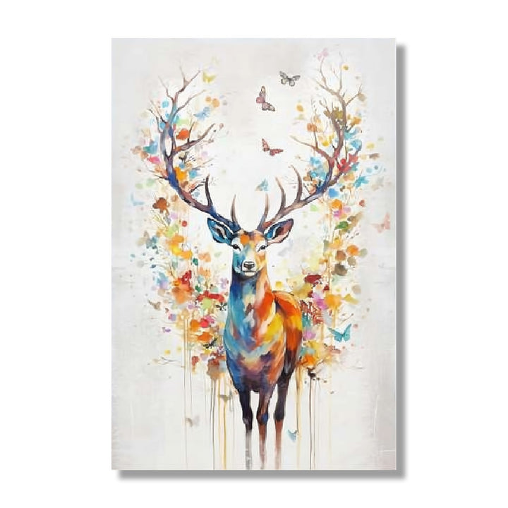 The painting showcases a magnificent deer with grand antlers, embellished with an array of vibrant leaves, delicate butterflies, and other natural elements. The artwork captures the enchanting beauty of the animal kingdom, inviting viewers into a world where wildlife and flora harmoniously intertwine.