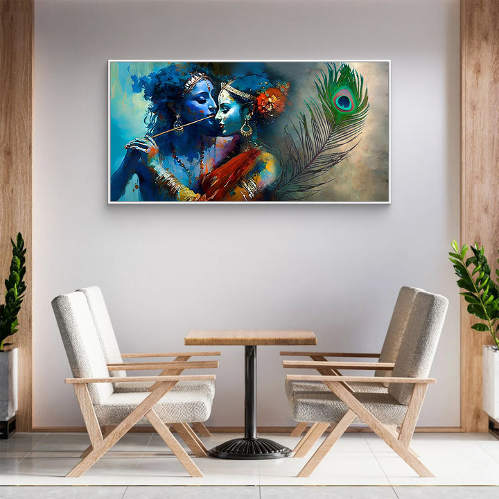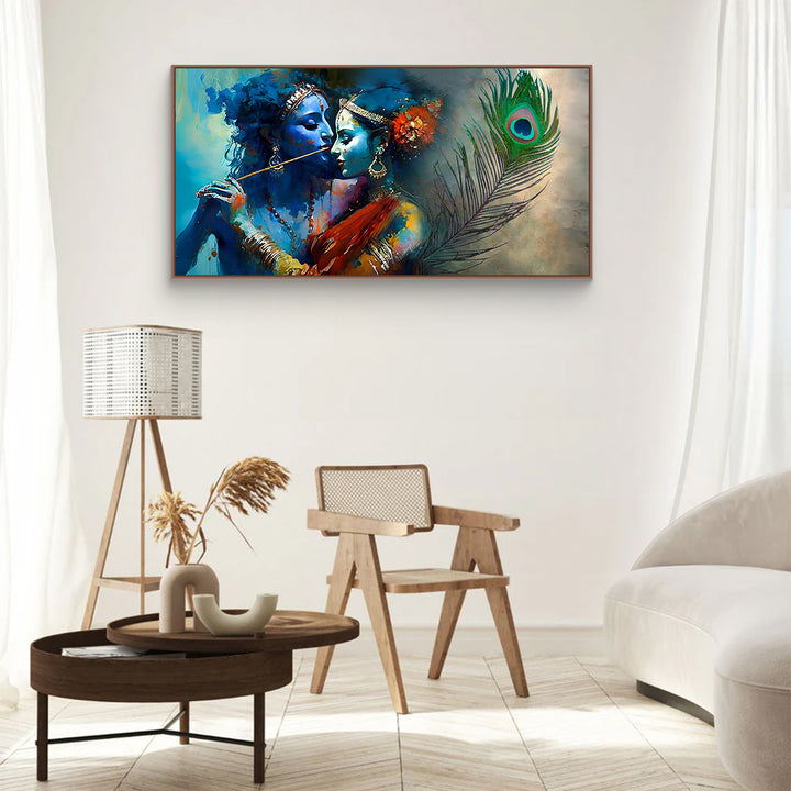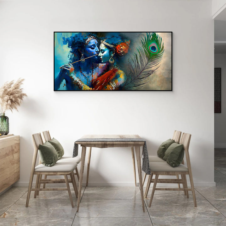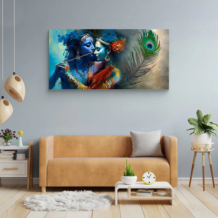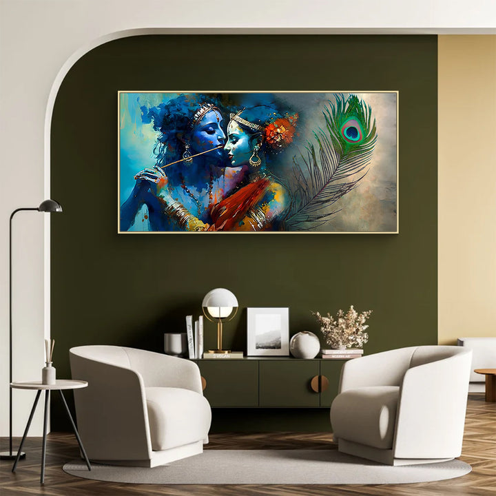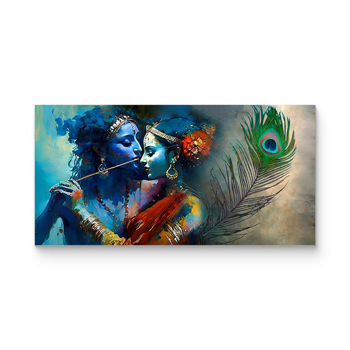 'Divine Souls' depicts the eternal love between Radha and Krishna, with Radha adorned in vibrant blue attire and Krishna holding a single peacock feather. The blue theme symbolizes tranquility and spirituality, creating a serene paradise for the divine couple's embrace.