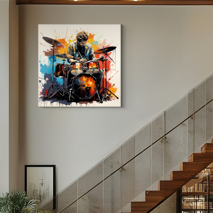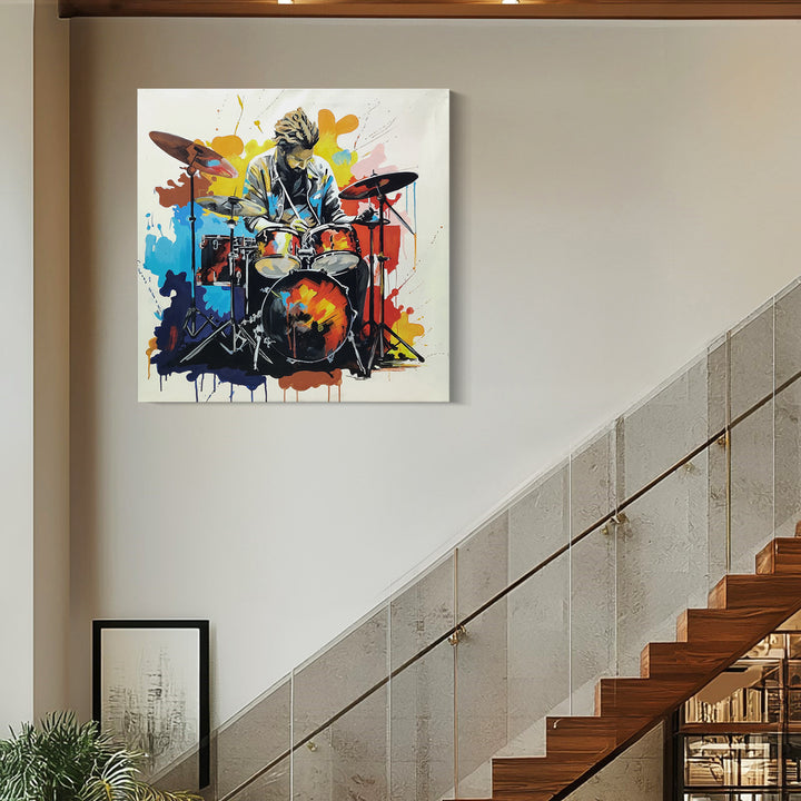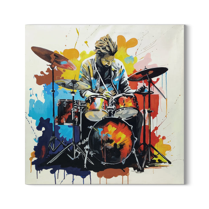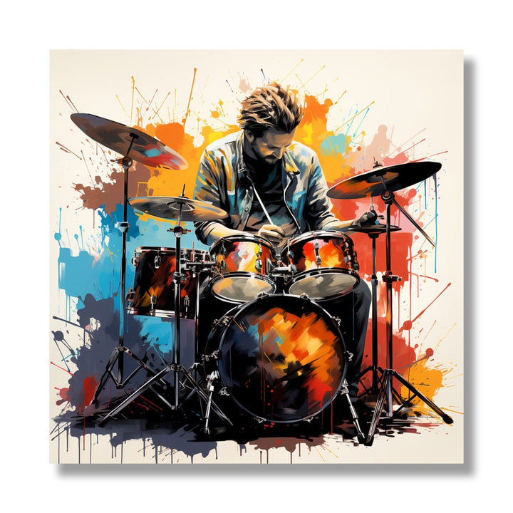 The painting is a vibrant and energetic painting capturing the essence of men playing drums, his lively gesture demonstrating how he feels the music, as the rhythm of drumbeats fills the air with an electrifying energy.