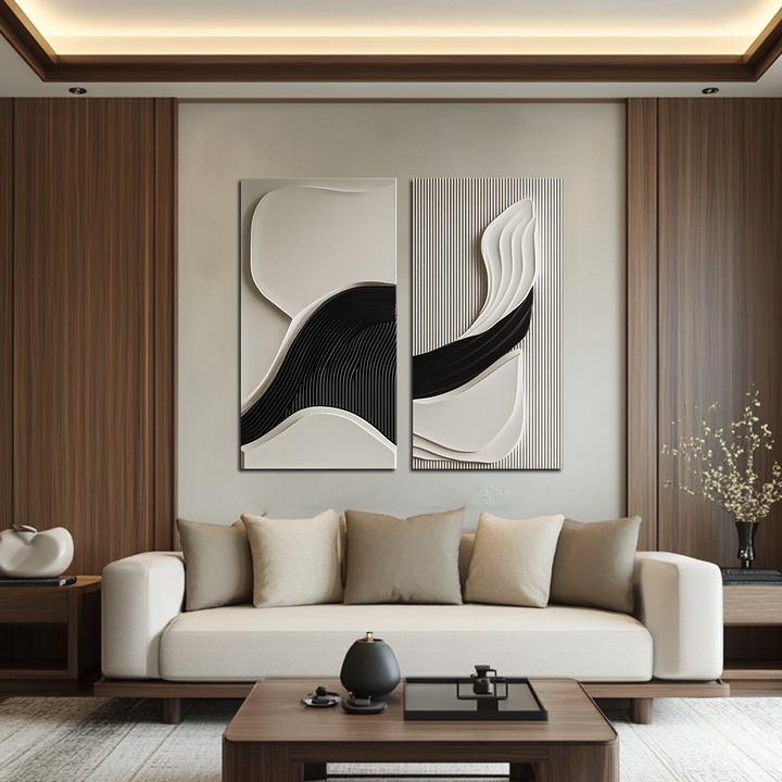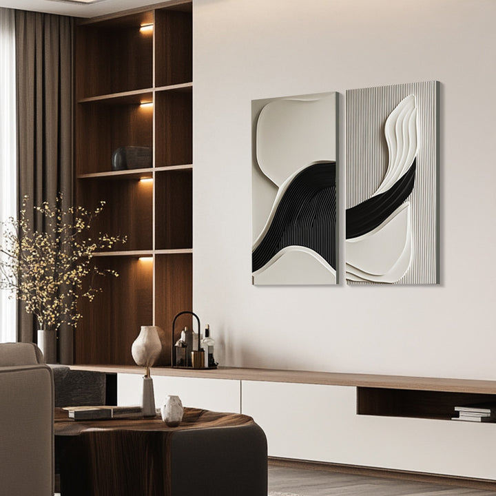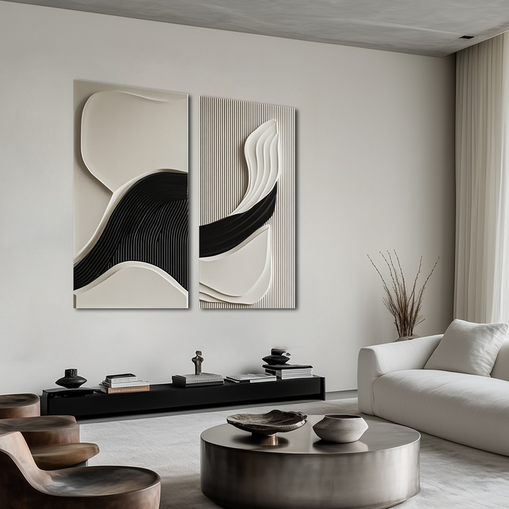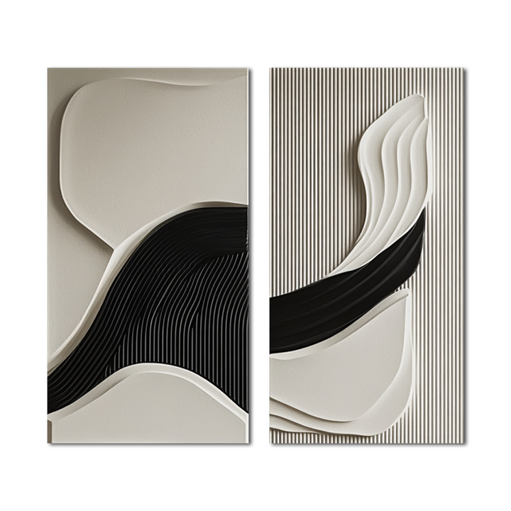 This handcrafted 3D wall decor set showcases an elegant fusion of smooth flowing waves and structured textures, creating a dynamic interplay of light and shadow. The contrasting black and neutral beige tones add depth, making it an ideal modern statement art piece for luxury homes, offices, and contemporary interiors. Perfect for lovers of minimalist, abstract, and geometric artwork, this textured wall panel duo brings sophistication and movement to any space.