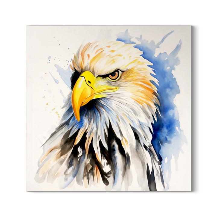 This painting depicts a white-headed eagle with its piercing gaze, captured in realistic style against a water brush effect blue background. The vibrant colours and intricate details capture the grace and power of this magnificent bird.