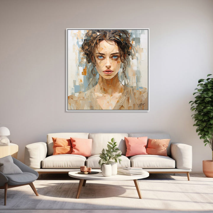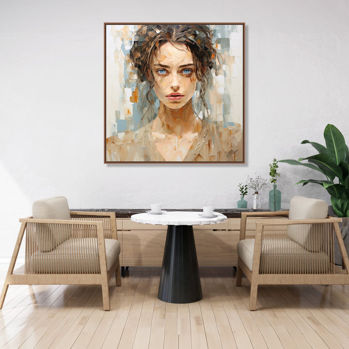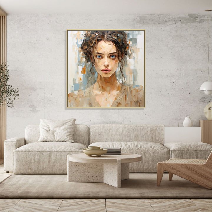 'Earthen Beauty' captures the serene beauty of a person with brown hair and blue eyes, set against a backdrop of earthy hues. The combination of warm and cool tones creates a harmonious and calming atmosphere, inviting viewers to appreciate the tranquillity and natural allure of the subject.