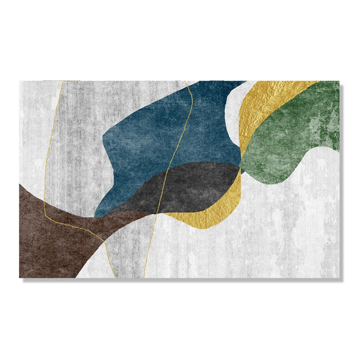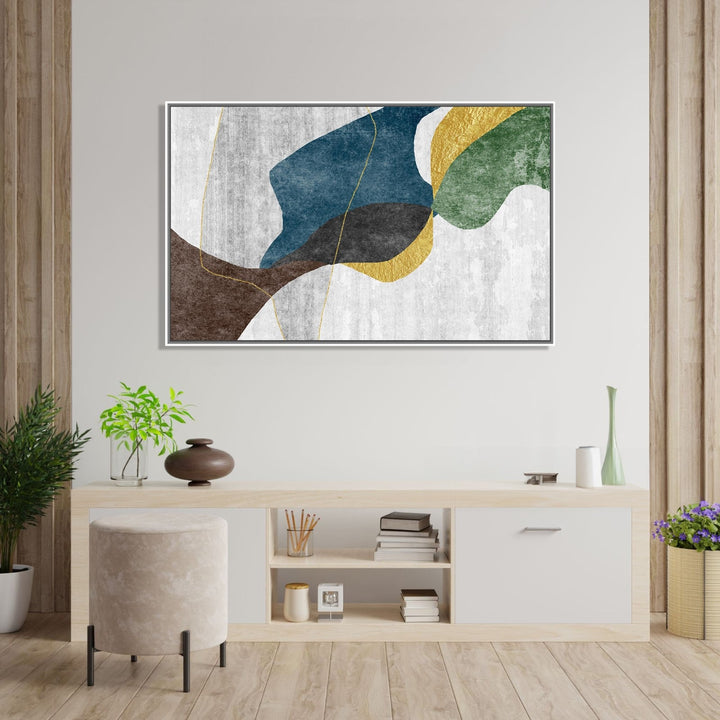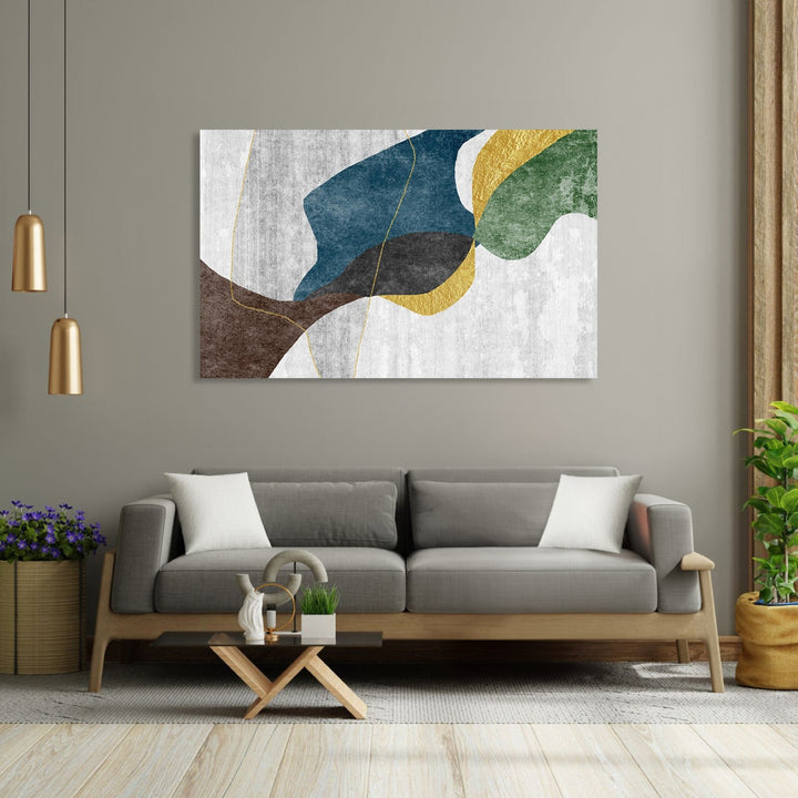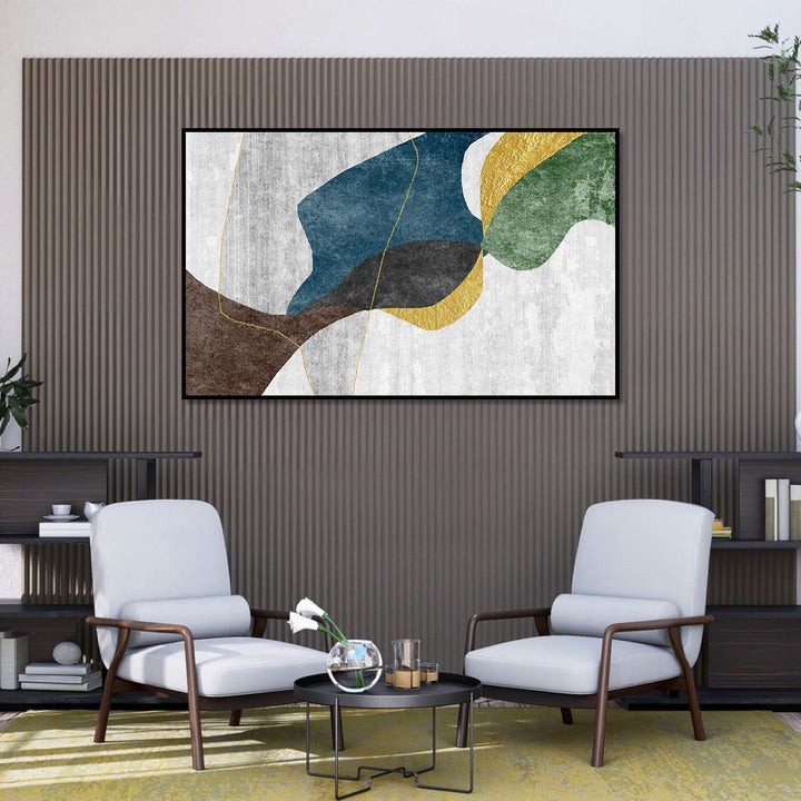 This handmade painting features a stunning combination of brown, blue, yellow, and green waves that flow gracefully across a subtle grey background. The colors blend seamlessly together, creating a sense of movement and depth within the piece. A striking golden line stroke adds a touch of elegance and contrast to the abstract texture of the painting. The overall composition is both dynamic and soothing, inviting the viewer to get lost in the intricate details and unique color palette. This abstract painting is a true work of art that will add a touch of sophistication to any space it is displayed in.