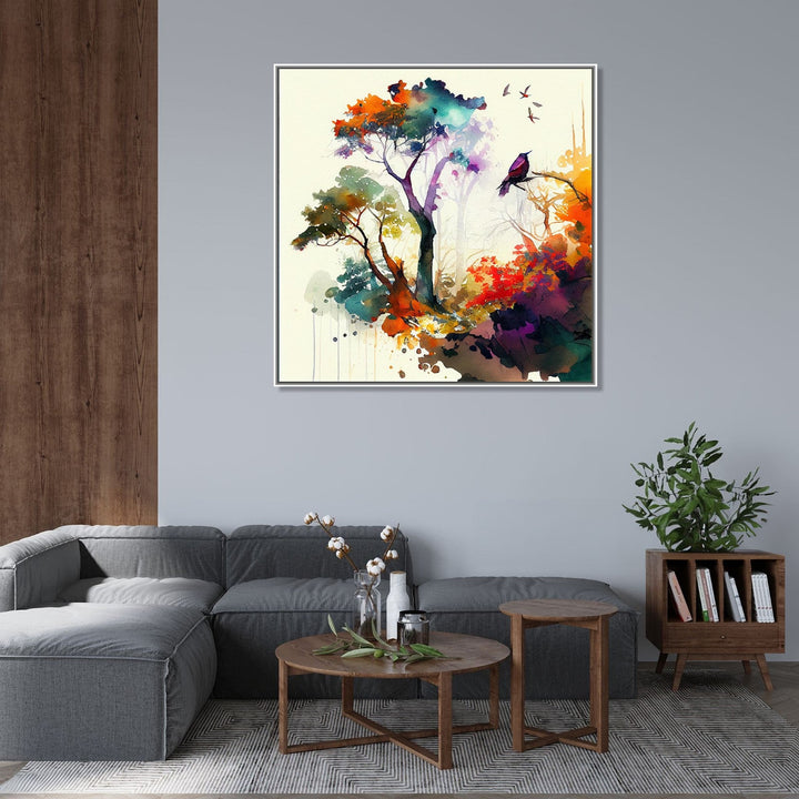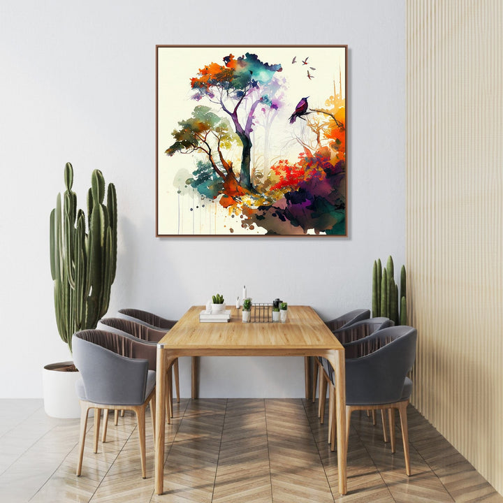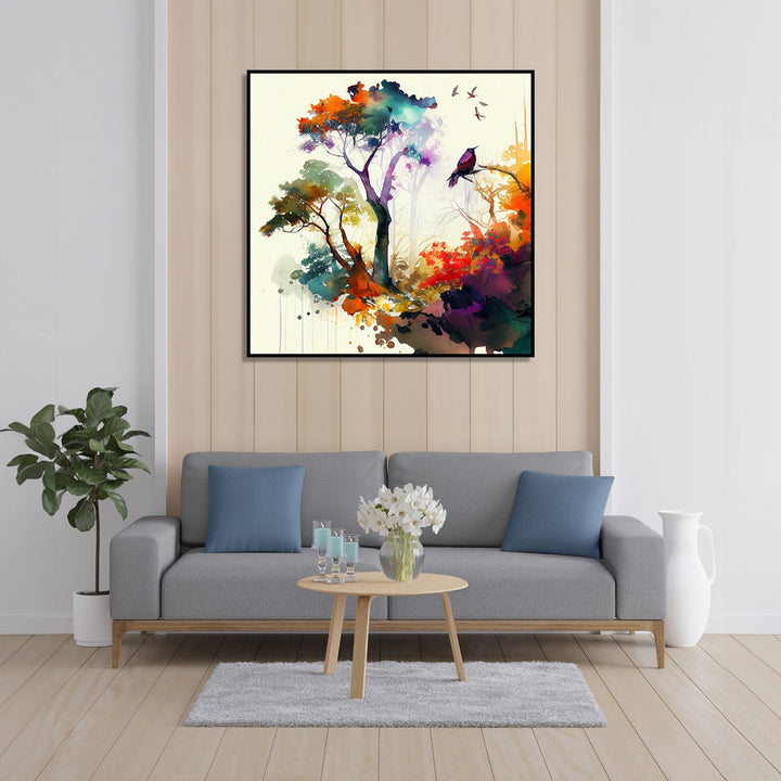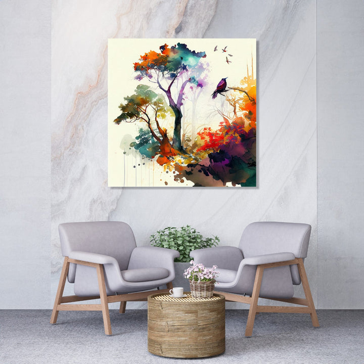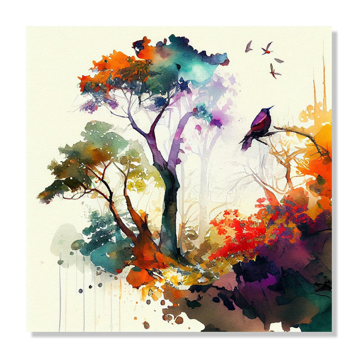 This stunning handmade watercolor painting features a vibrant and colorful scene of trees, birds, and birds flying in the air. The trees are depicted with intricate details, showcasing their lush green leaves and twisting branches. The birds are beautifully captured in mid-flight, their wings outstretched as they soar through the sky. The use of bold and bright colors creates a sense of movement and energy in the painting, making it come alive with a sense of joy and freedom. The delicate brushstrokes and blending of colors add depth and dimension to the artwork, drawing the viewer in to explore every corner of the scene. This piece would make a beautiful addition to any art collection, bringing a touch of nature and whimsy to any space.