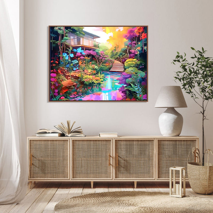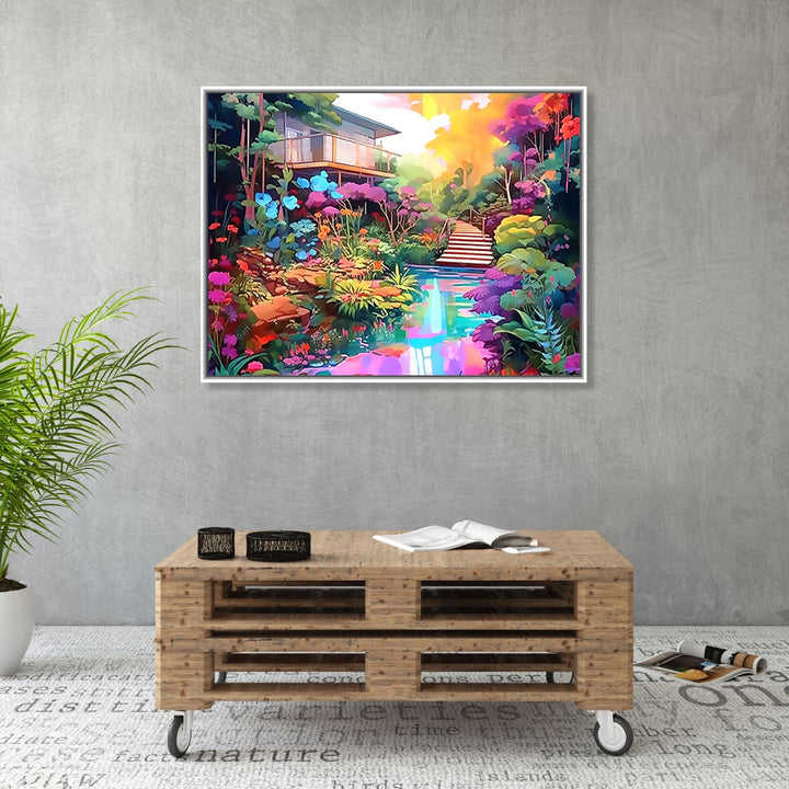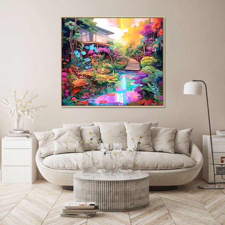 'Enchanting Journey' captures the beauty of a house nestled amidst lush trees and a serene water body. The vibrant purple color theme adds a touch of enchantment, while the stairs invite viewers on a captivating journey through nature's wonders.