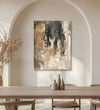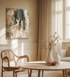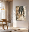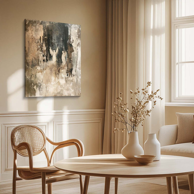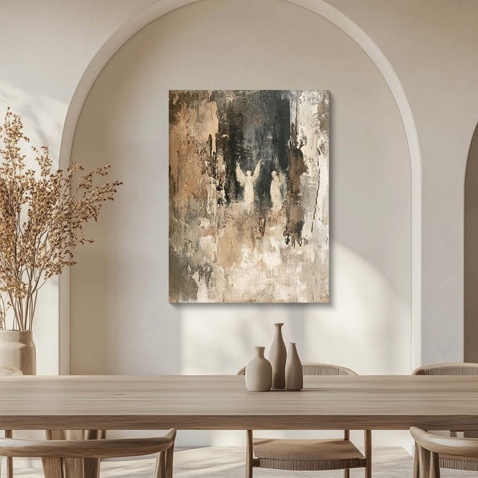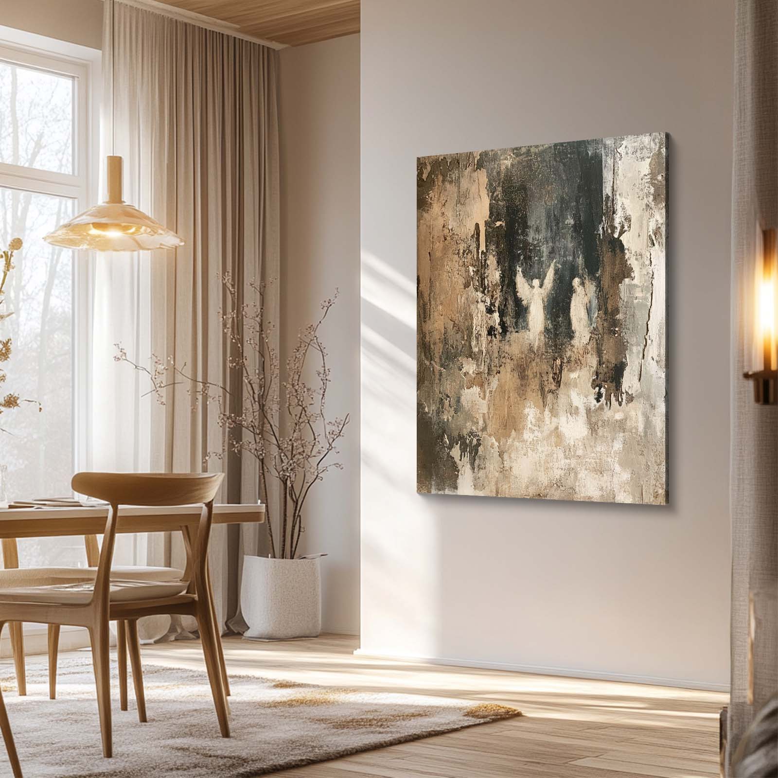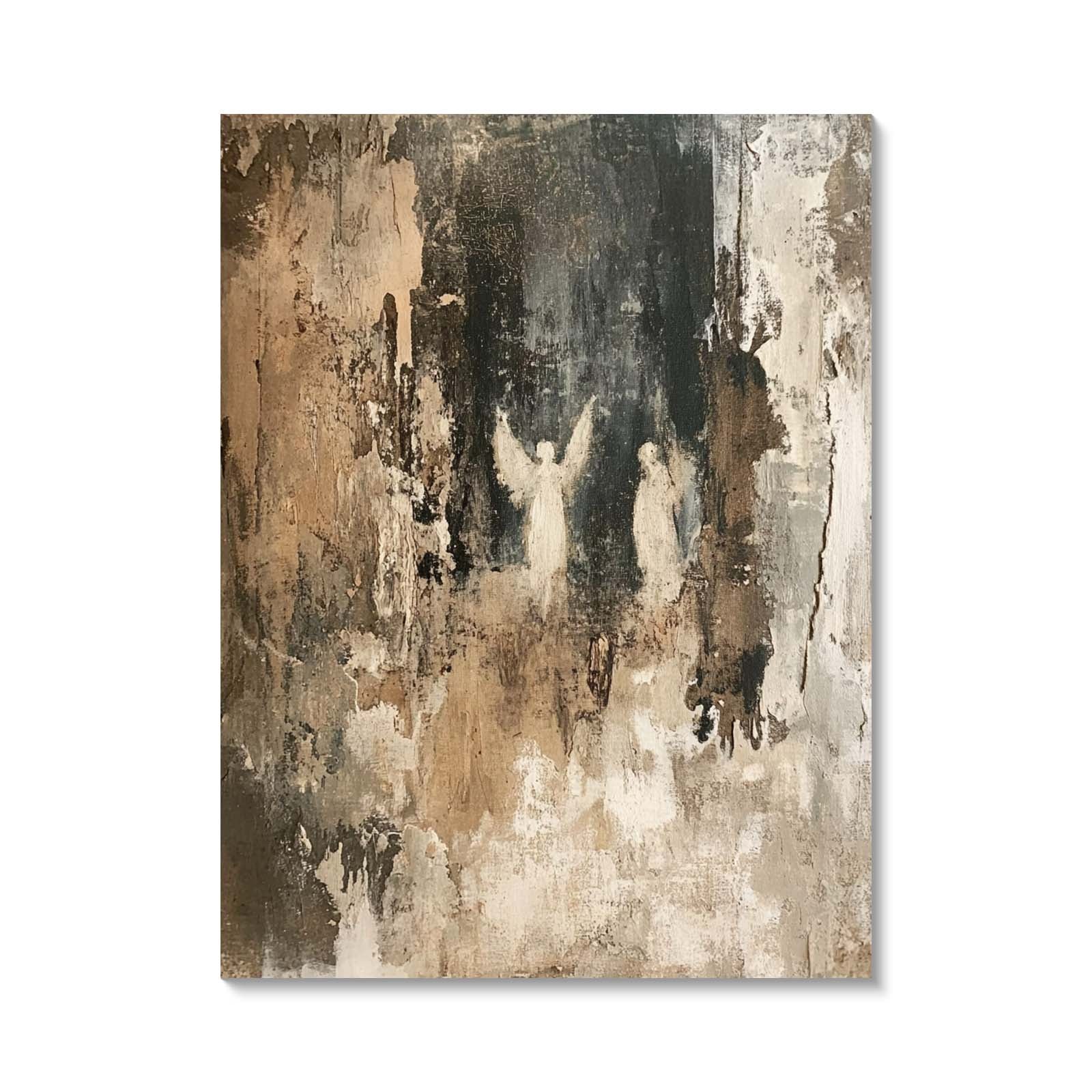 Depicts abstract angelic figures amidst earthy, muted textures, evoking a sense of serenity and spirituality.