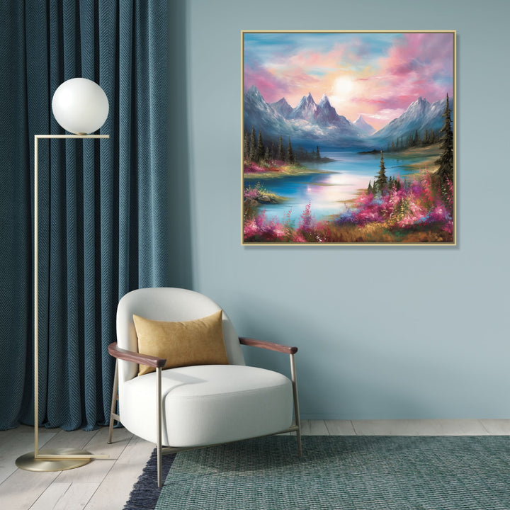 'Serene Reflections' captures the tranquil beauty of a winter landscape, with a pink and blue sky reflecting off the calm waters below. Snow-capped mountains rise majestically in the distance, creating a serene and awe-inspiring scene.