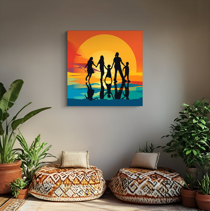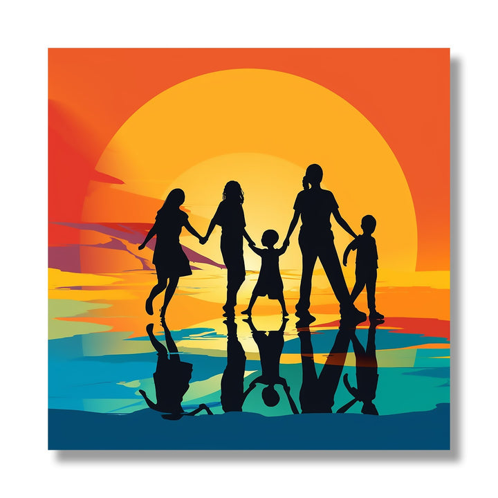 The painting captures the beautiful bond of a family of five as they walk together, their silhouettes blending seamlessly with the vibrant hues of a breathtaking sunset. The shadows symbolize their unity and the warmth of their love, creating a serene and captivating scene.