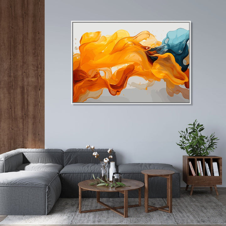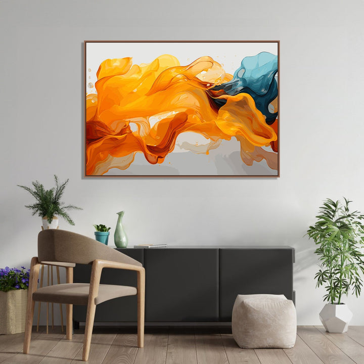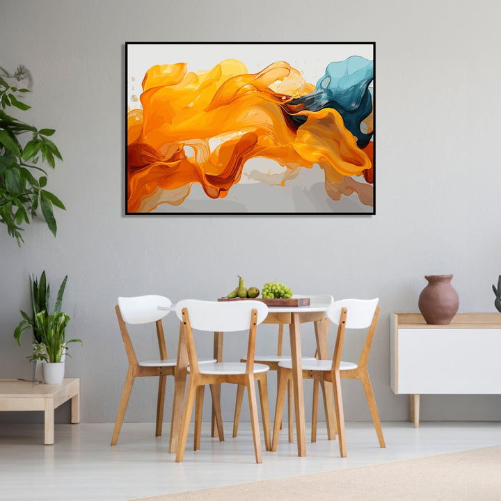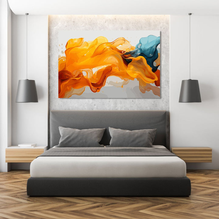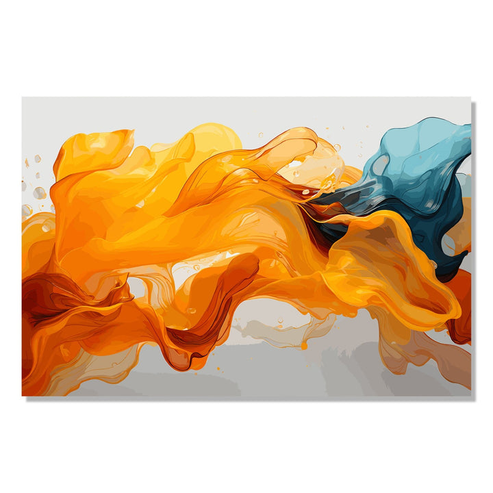 This handmade painting features a stunning abstract composition that captures the essence of a water wave in vibrant shades of orange, yellow, and blue. The colors blend seamlessly together, creating a sense of movement and fluidity that mimics the natural beauty of a crashing wave. The brushstrokes are dynamic and energetic, adding depth and texture to the piece. The overall effect is mesmerizing and evocative, drawing the viewer in and inviting them to get lost in the swirling patterns and colors of the artwork. This painting would make a striking addition to any space, bringing a sense of energy and tranquility to the room.