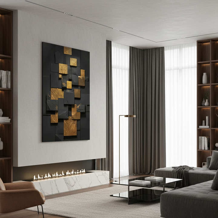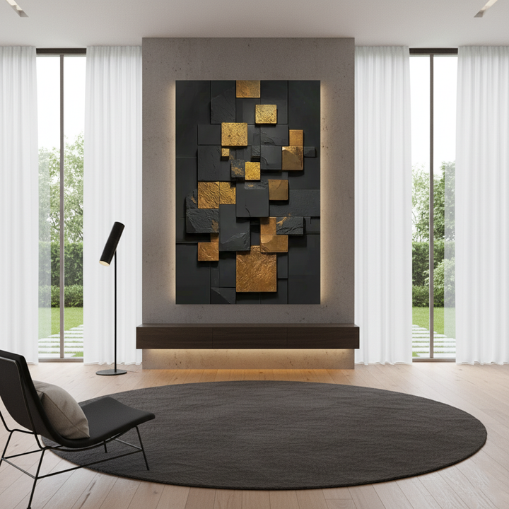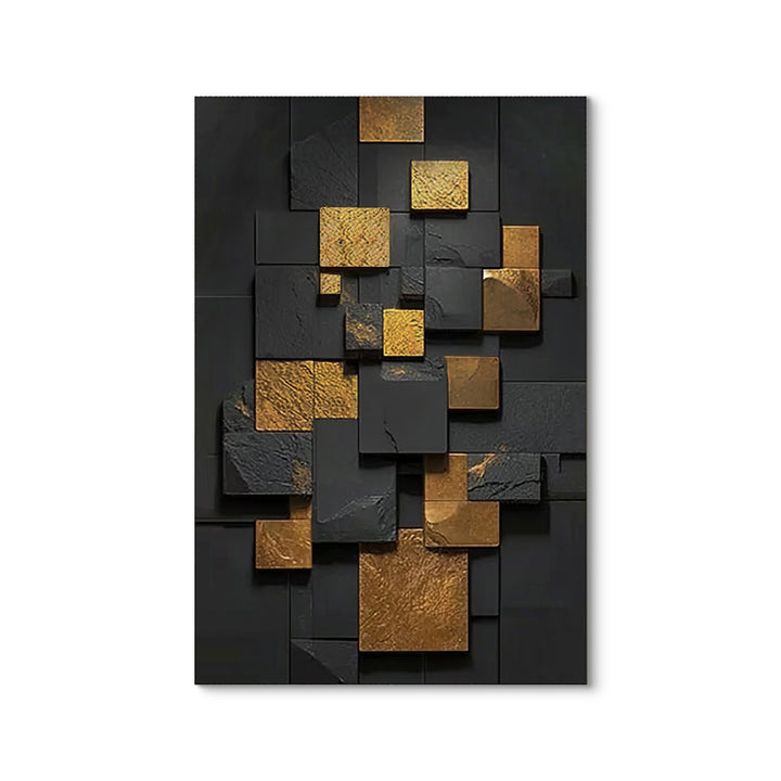 This geometric 3D wall sculpture features layered golden foil and black cubes in varying dimensions. A perfect modern statement art piece for luxury interiors, offices, and artistic homes.
