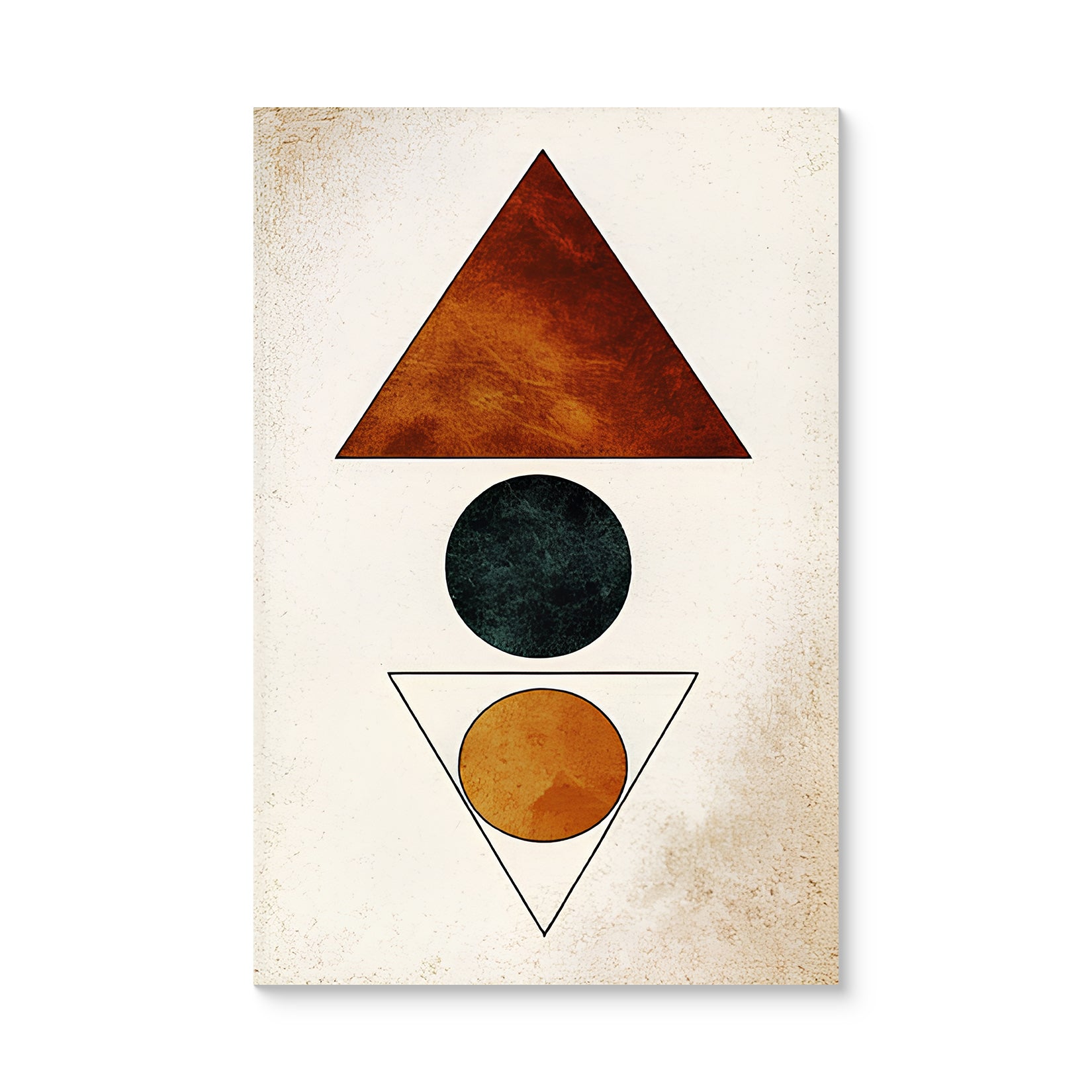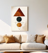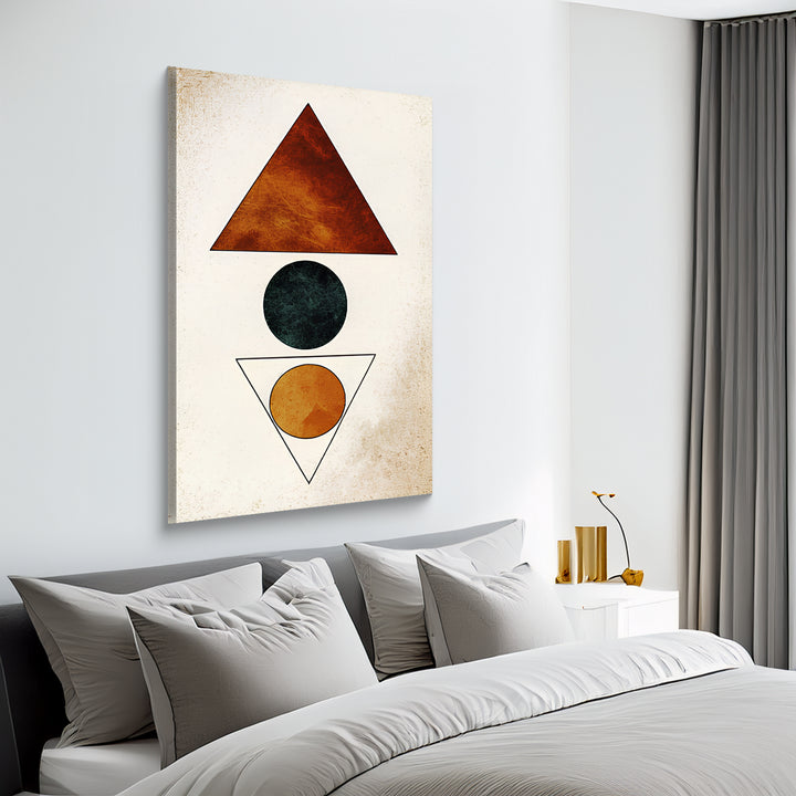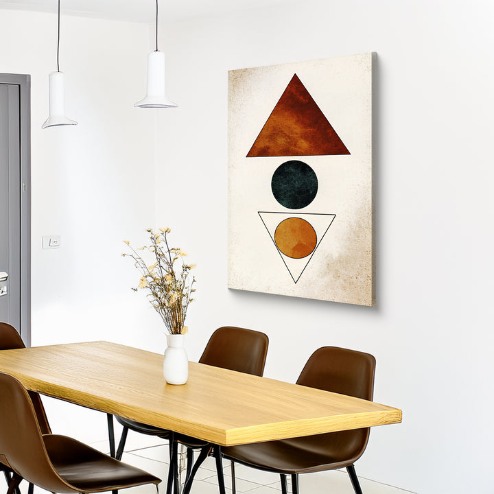 A minimalist geometric artwork using triangle and circle shapes in earthy red, black, and mustard tones to create a sense of symmetry and calm.