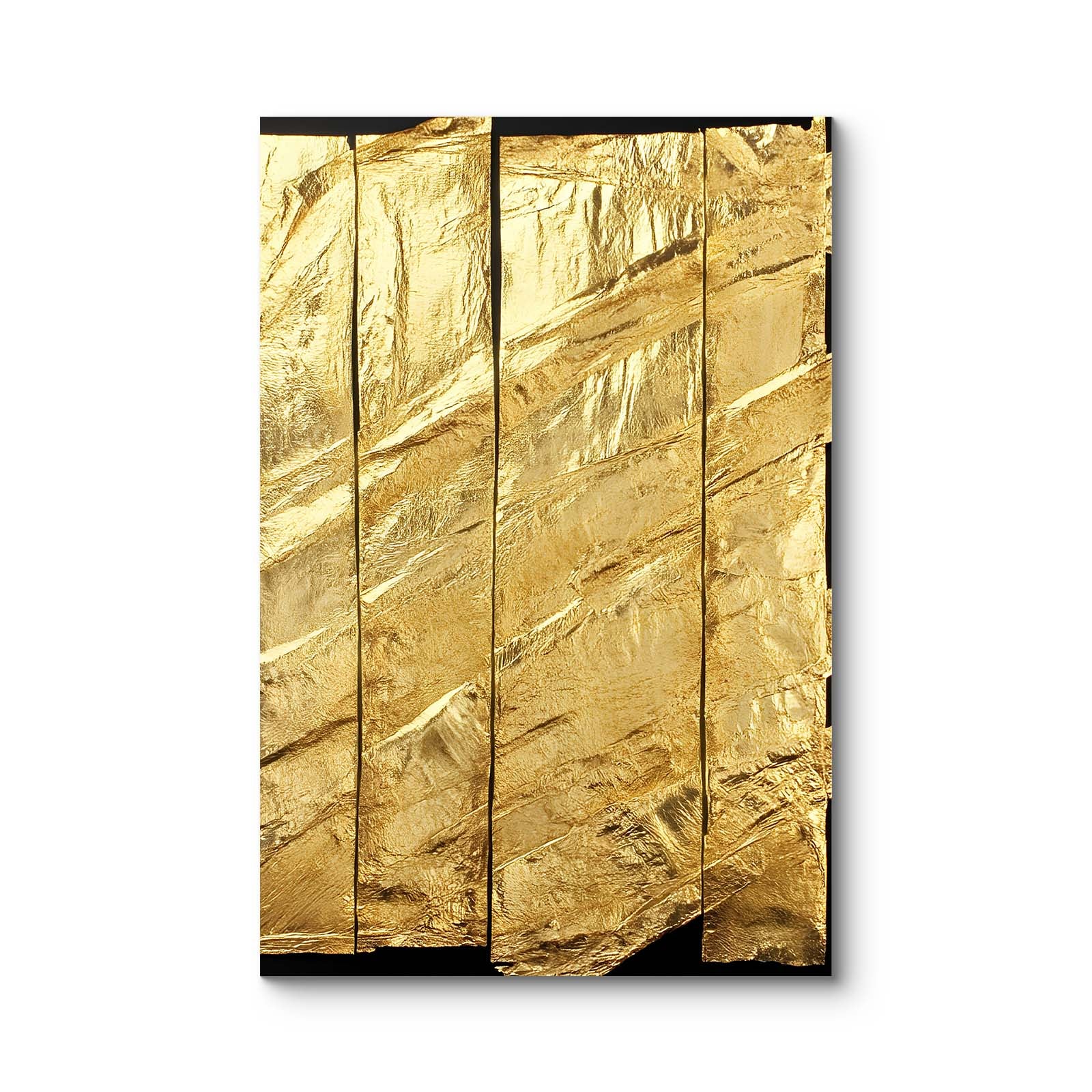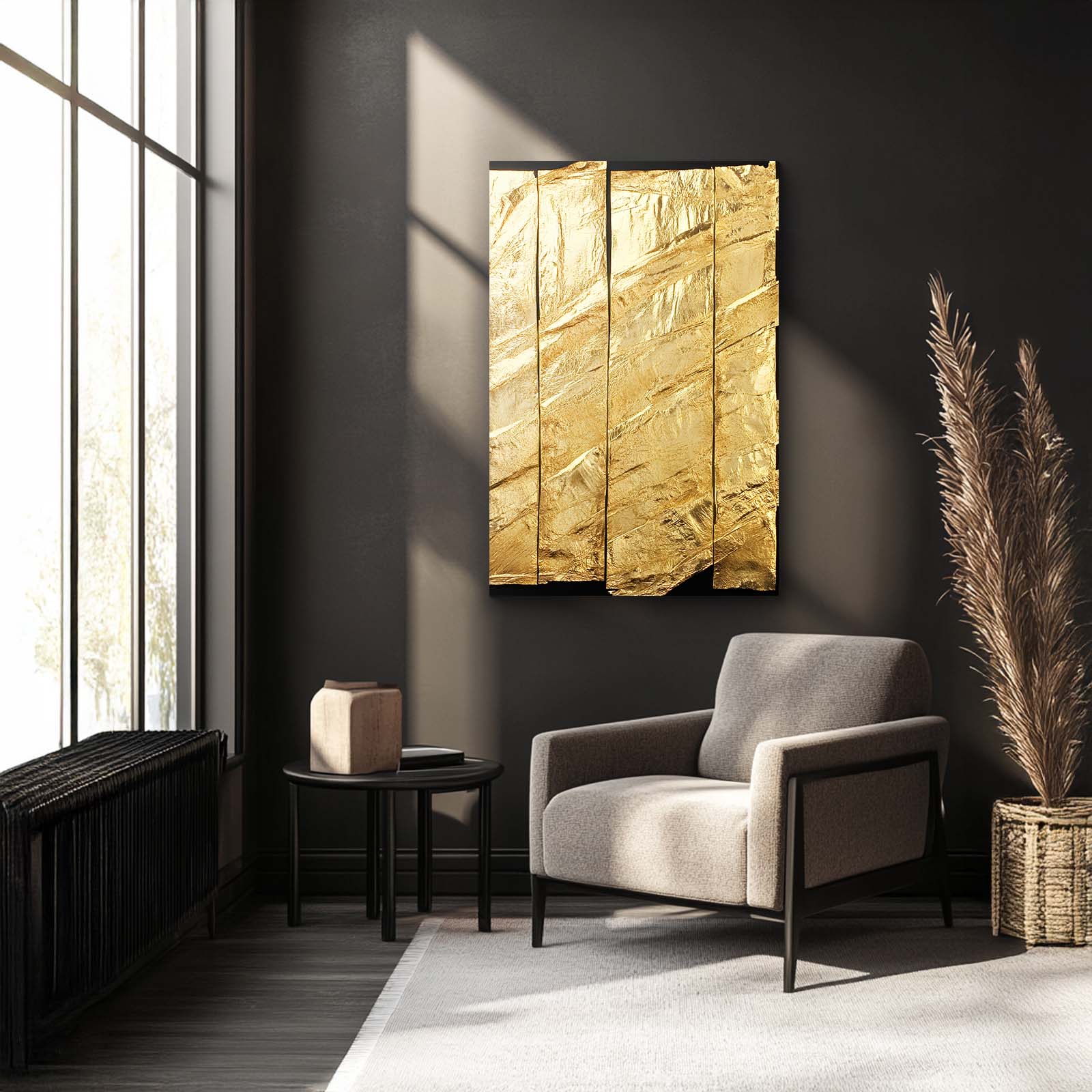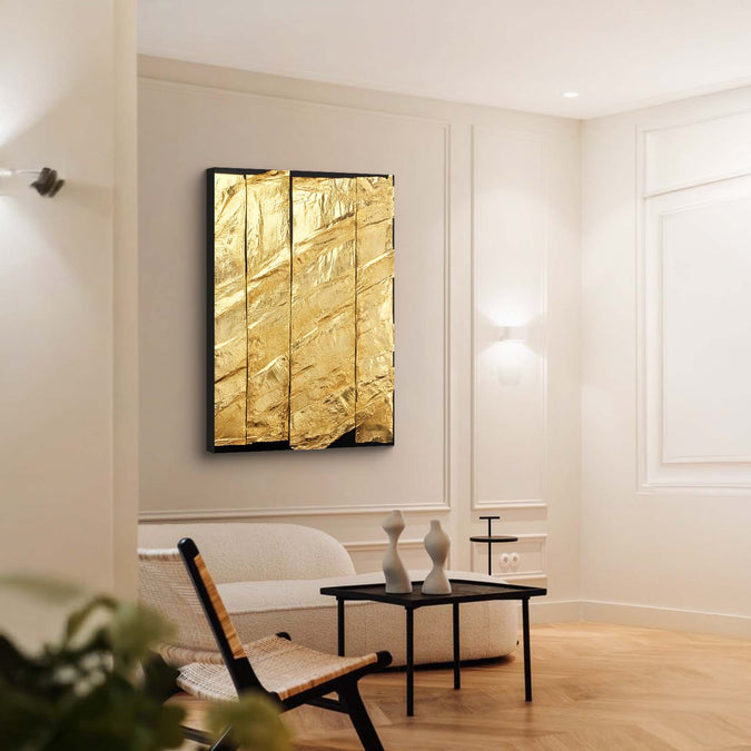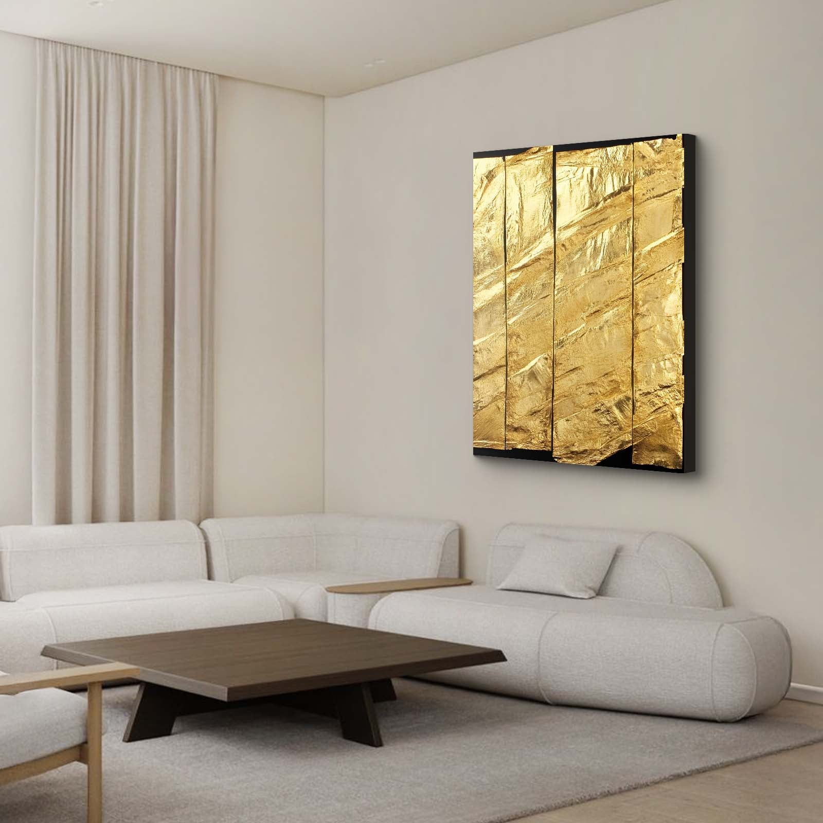 This elegant gold textured panel artwork is designed to add a luxurious touch to modern interiors. The rich metallic foil creates depth and visual intrigue, perfect for high-end decor.